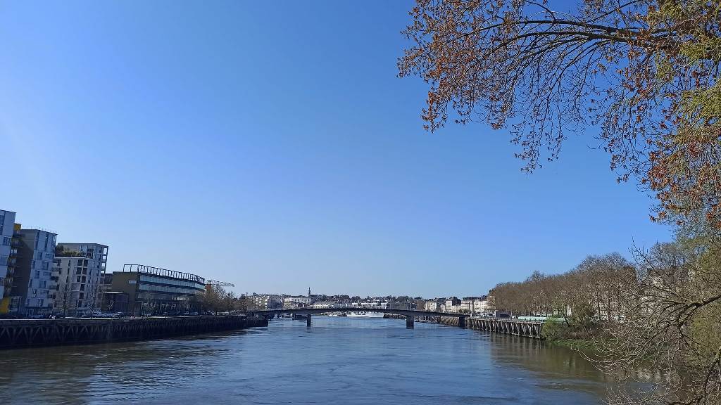 …με τον ποταμό να ανοίγει τα τεράστια νερένια μπράτσα του και να σφιχταγκαλιάζει το κόσμημα της πόλης, το πανέμορφο νησί της, το Ile de Nantes, το οποίο προέκυψε μετά από εκτεταμένα έργα ανάπλασης στην καρδιά της πόλης. Εδώ, η θέα της Νάντης από το κατάστρωμα ενός ποτάμιου κρουαζιερόπλοιου, που είναι δεμένο στο ΒΔ άκρο του νησιού.