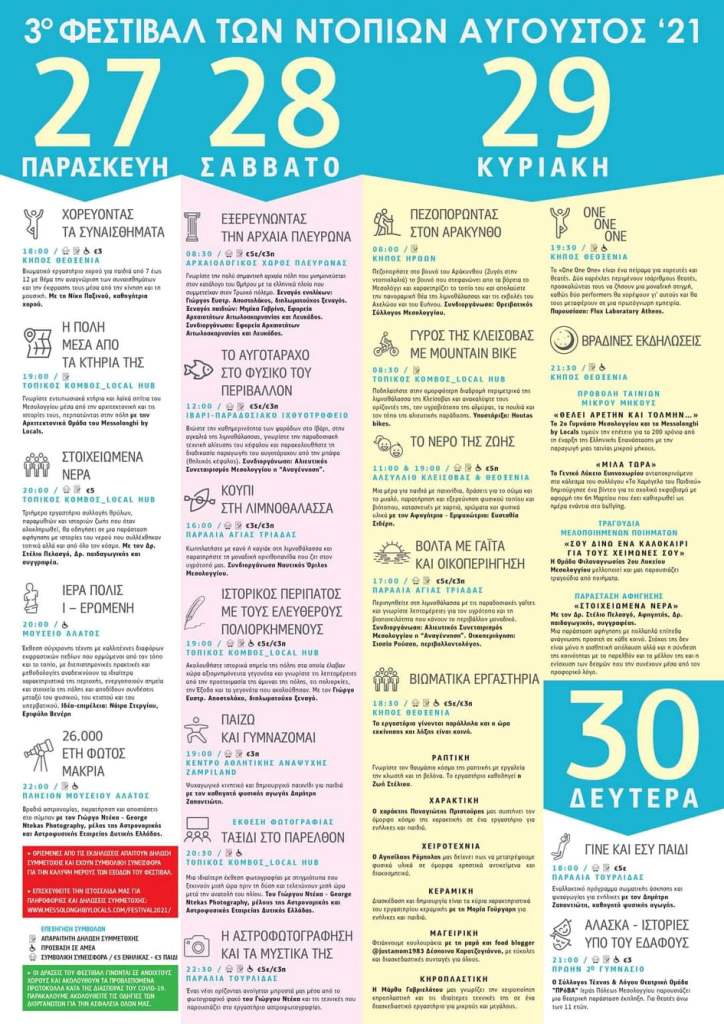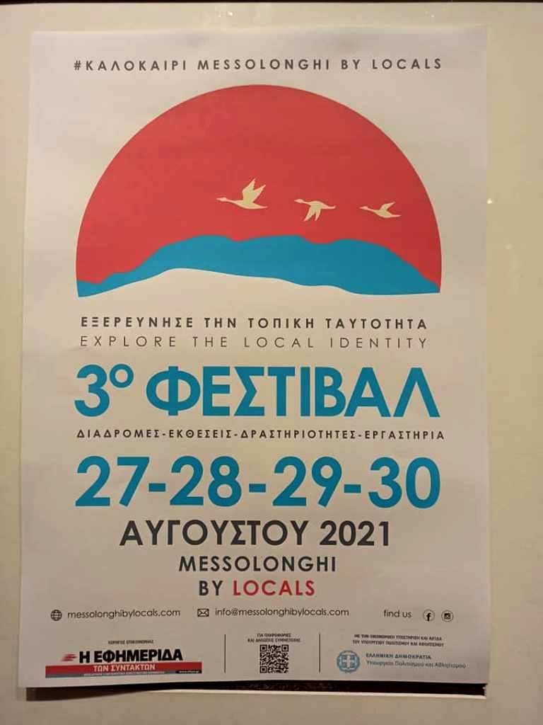 Tο 3ο Φεστιβάλ «Messolonghi by Locals: Εξερεύνησε την τοπική ταυτότητα» πραγματοποιήθηκε στο Μεσολόγγι από τις 27 έως και τις 30 Αυγούστου 2021, σε ένα χορταστικό τετραήμερο με παράλληλες δράσεις για διασκέδαση και εξερεύνηση στοιχείων, που συνθέτουν το μωσαϊκό της πολυπολιτισμικής ταυτότητας της πόλης, αλληλεπιδρώντας παράλληλα με τους ντόπιους και το περιβάλλον του Μεσολογγίου. Συγκεκριμένα, το πρόγραμμα περιελάμβανε ξεναγήσεις στην πόλη και σε αρχαιολογικούς χώρους, διαδρομές, πεζοπορίες, ποδηλασία, κανό/καγιάκ και δραστηριότητες στη φύση, εκθέσεις, συζητήσεις, βιωματικά εργαστήρια, προβολές και τοπική γαστρονομία. Οι συμμετέχοντες είχαν την ευκαιρία να περιηγηθούν σε μνημεία αρχαίων γειτονικών πόλεων, να απολαύσουν τα σαγηνευτικά τοπία και ηλιοβασιλέματα της λιμνοθάλασσας, να γευτούν τοπικά προϊόντα και να αισθανθούν την ζεστή φιλοξενία, που χαρακτηρίζει τους Μεσολογγίτες, οι οποίοι κατά τη διάρκεια του Φεστιβάλ έγιναν οι ίδιοι «ξεναγοί» στον τόπο τους, ταξιδεύοντας τους συμμετέχοντες στον χώρο, τον χρόνο, αλλά και σε γνωστές και άγνωστες πτυχές του Μεσολογγίου. Καλλιτέχνες, εικαστικοί, επαγγελματίες, αθλητές, μαθητές, επιχειρηματίες και εθελοντές συνέπραξαν ώστε όλοι οι συμμετέχοντες να αποχαιρετήσουν τον Αύγουστο και το καλοκαίρι δημιουργικά και διασκεδαστικά.