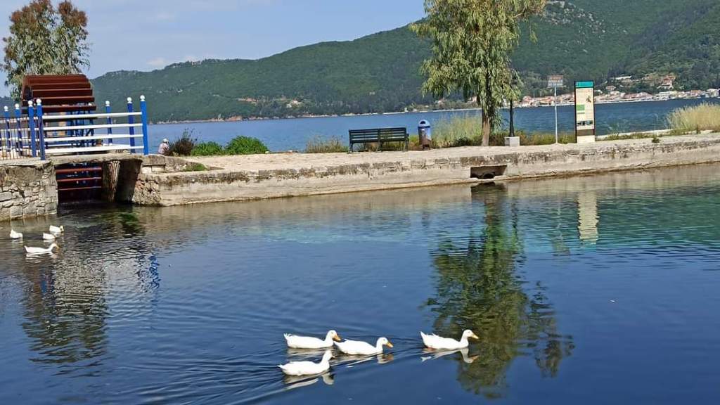 …και εδώ αντίστοιχα η Σάμη, όπως φαίνεται από την ανατολική πλευρά του Καραβόμυλου, όπου και η χαρακτηριστική λιμνούλα με τον νερόμυλο.