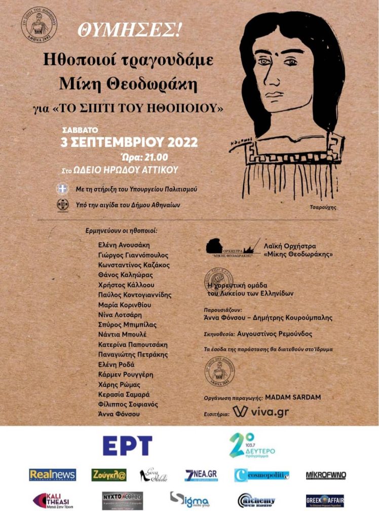 Είναι γνωστό ότι ο Μίκης Θεοδωράκης αγαπούσε και θαύμαζε τους ηθοποιούς. Πίστευε ότι όταν τραγουδούν οι ηθοποιοί, αποδίδεται καλύτερα ο στίχος, ερμηνεύεται καλύτερα ο λόγος! Μάλιστα, είχε παραχωρήσει στο Σπίτι του Ηθοποιού, τα δικαιώματα 18 τραγουδιών του, λέγοντας τότε χαρακτηριστικά ότι θαυμάζει και αγαπά ιδιαίτερα τους ηθοποιούς, διότι οι περισσότεροι στο βάθος κρύβουν ένα καλό τραγουδιστή. Διευκρίνισε επίσης ότι παραχωρεί αυτά τα τραγούδια και τα δικαιώματά τους, γιατί ο σκοπός είναι ιερός! Και πραγματικά ο σκοπός είναι ιερός. Γιατί και τα έσοδα αυτής της βραδιάς, έναν χρόνο μετά τον θάνατο του μεγάλου μας συνθέτη, στις 3 του Σεπτέμβρη και μάλιστα στο Ηρώδειο, δύο βήματα από το σπίτι του, θα δοθούν αποκλειστικά στο Σπίτι του Ηθοποιού.