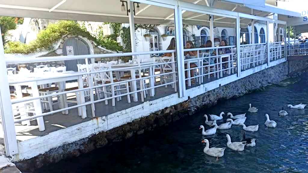 …από τα πιάτα της οποίας μόνο κάποια ψιχουλάκια ψωμιού περισσεύουν για τις χαριτωμένες πάπιες και χήνες, που επίσης έχουν εδώ το στέκι τους.