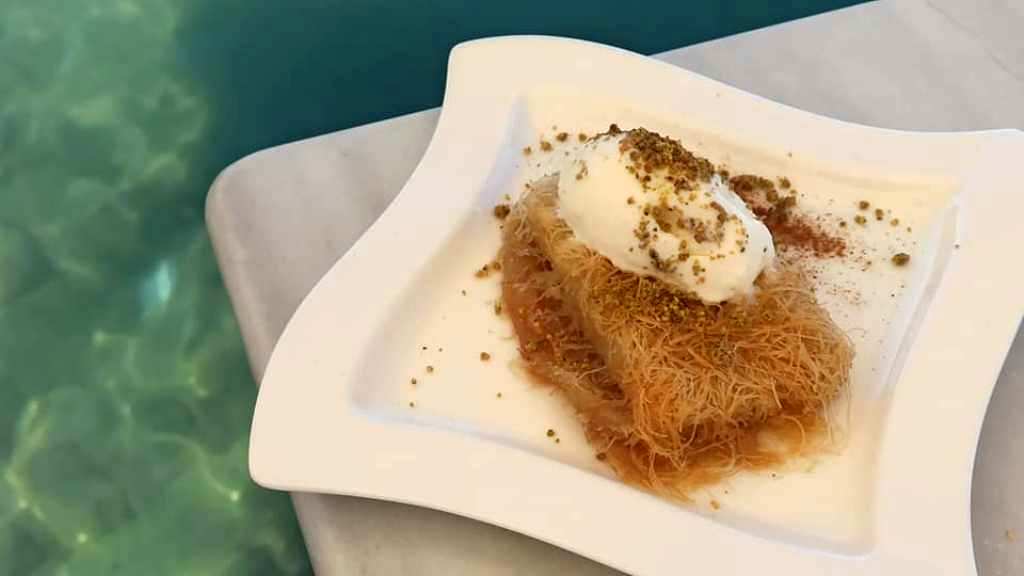 Εκμέκ με καραμελωμένο κανταΐφι και κρέμα μαστίχα με φυστίκι Αιγίνης. Παιχνιδίσματα υφών για το ιδανικό φινάλε ενός καθ’ όλα άψογου γεύματος.