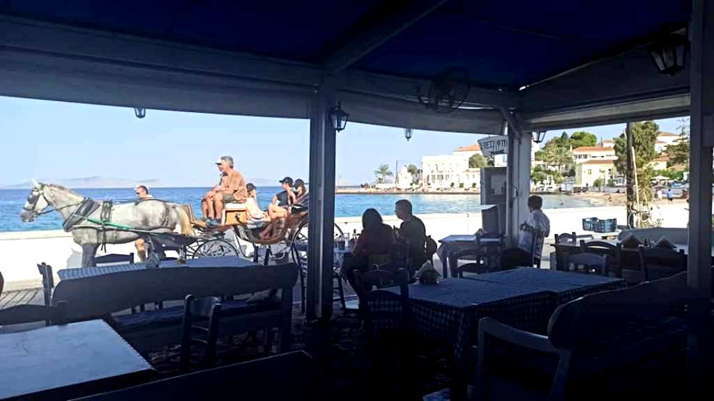 Οι άμαξες, το πλέον εμβληματικό μεταφορικό μέσον των Σπετσών, αποτελούν σχεδόν διακοσμητικό στοιχείο του χώρου, μιας και η διέλευσή τους είναι περίπου ανά λεπτό.