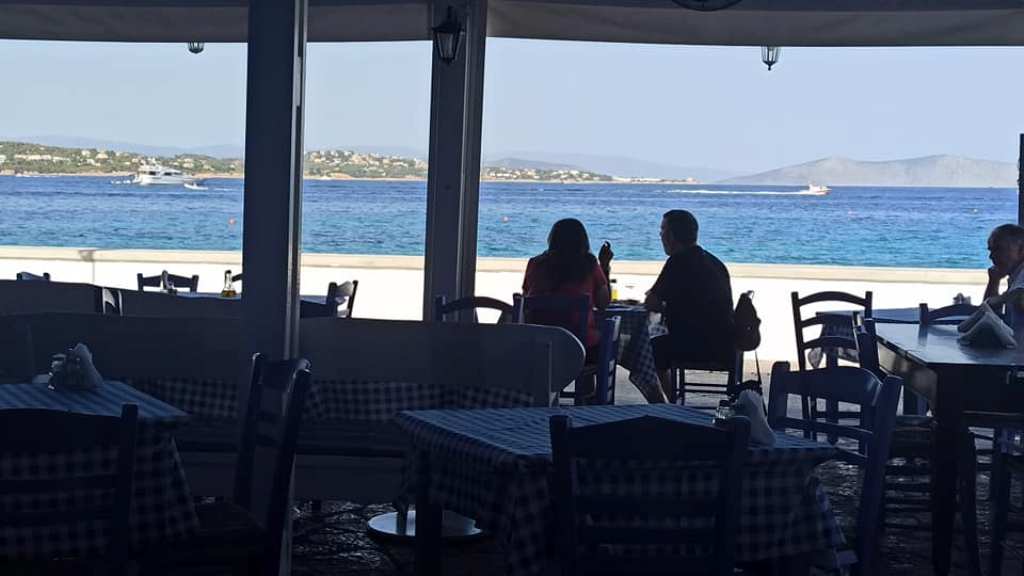 Τραπεζοκαθίσματα στο χρώμα της θάλασσας και καρώ τραπεζομάντηλα στα χρώματα της ελληνικής σημαίας, υπογράφουν την ελληνική ταυτότητα της παραδοσιακής αυτής ταβέρνας.
