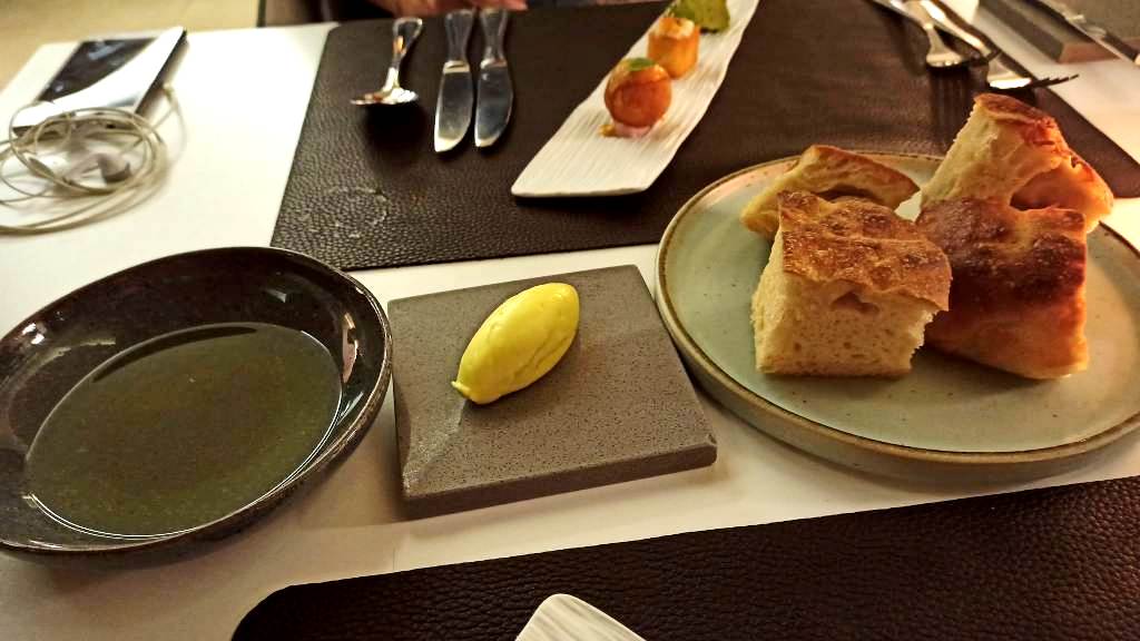 Πρώτη άφιξη στο τραπέζι μας το ελαιόλαδο Ρόδου, βούτυρο με μυρωδικά και χειροποίητη φοκάτσια, για ένα πολλά υποσχόμενο δείπνο.