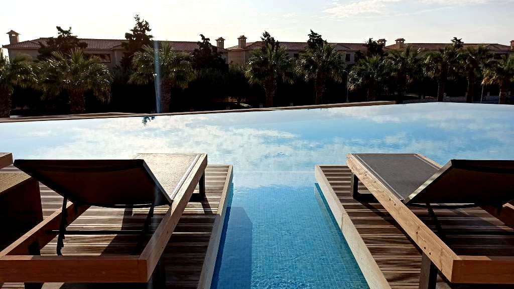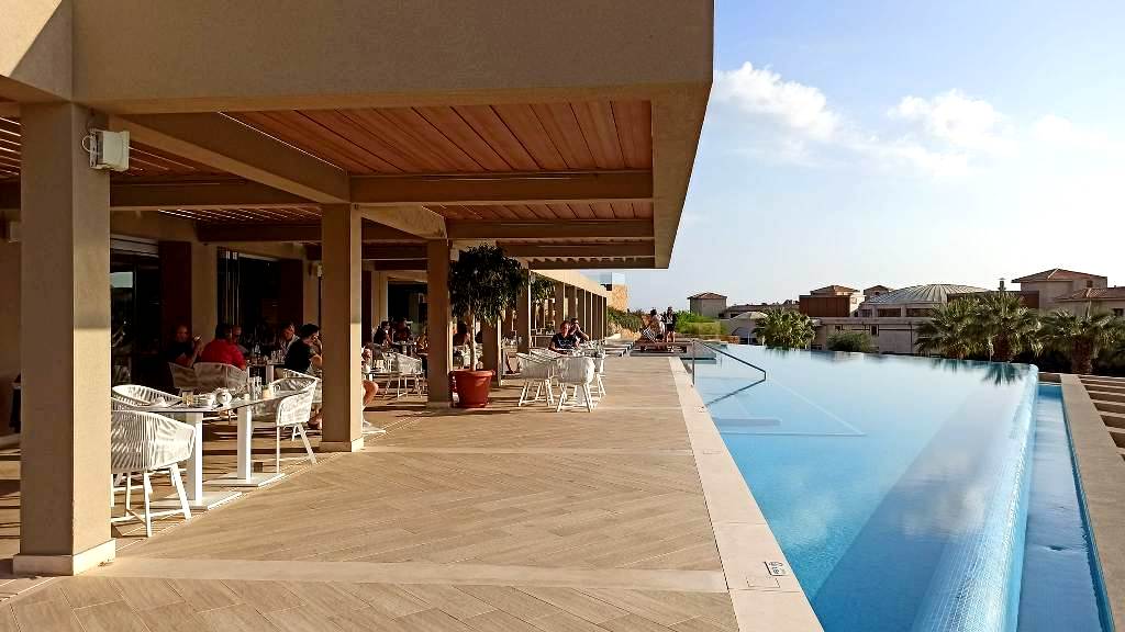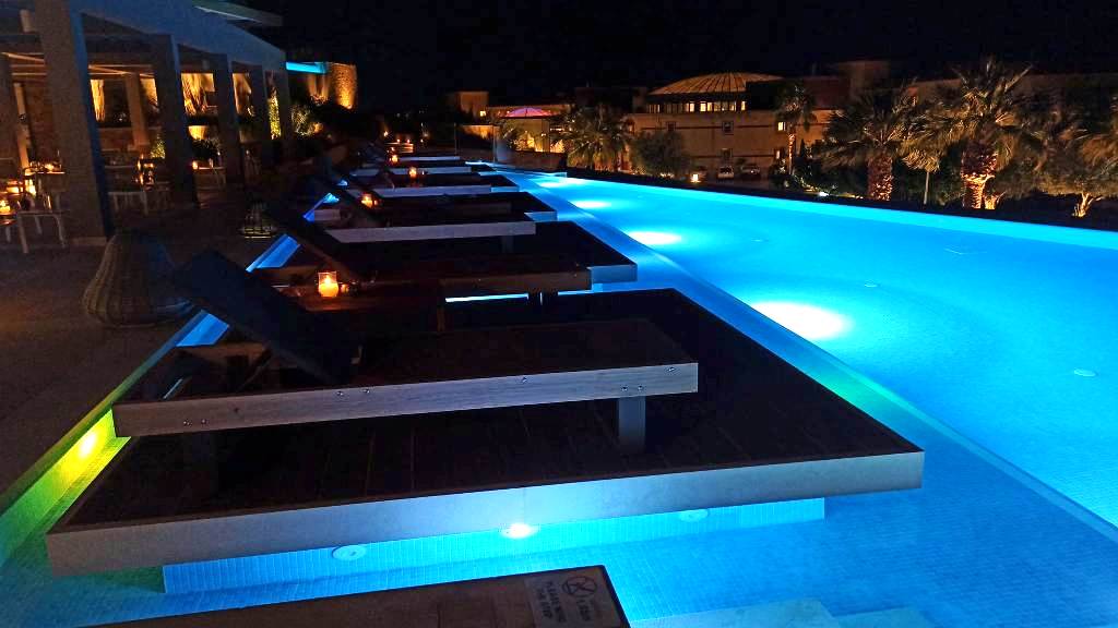 Ο ονειρεμένος ‘γαλάζιος κόλπος’ του Atlantica Imperial Residences, με το βουνό που ορίζει τον ορίζοντα στο βάθος, να φιλοξενεί στην κορυφή του τη Μονή της θαυματουργής Παναγίας Τσαμπίκας της Ψηλής.