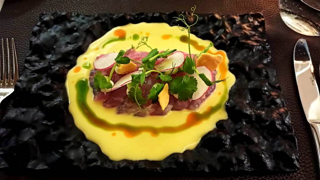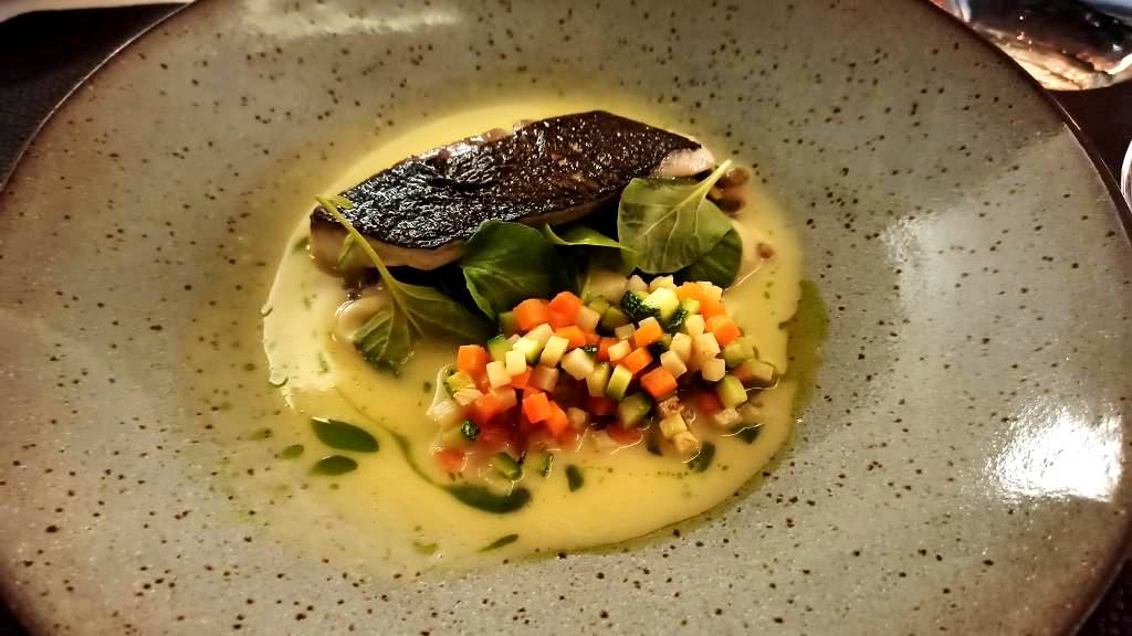 Ωριμασμένο λαβράκι σε ζωμό πατζαριού, με dressing εσπεριδοειδών, κόλιανδρο και λάδι τσίλι, μαρέγκα σόγιας, κρέμα ανθότυρου, ραπανάκι και αγγούρι. Ένα βαθιά αρωματικό και τόσο-όσο πικάντικο πιάτο που μας κέρδισε.