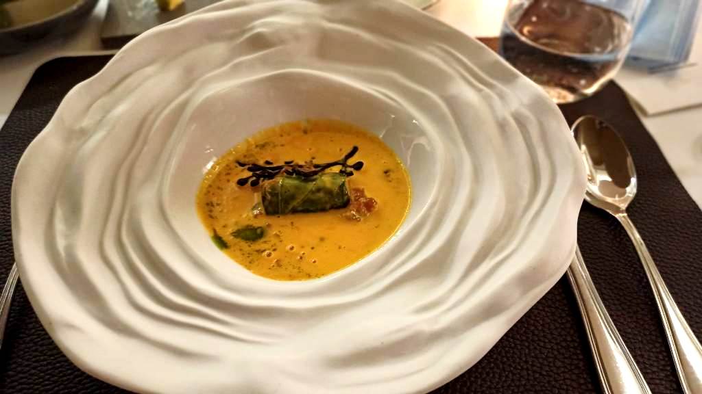 Περνώντας στα ζεστά ορεκτικά απολαύσαμε μια σούπα γαρίδας με λάδι μυρωδικών, με το οστρακοειδές τυλιγμένο σε φύλλο σέσκουλου, πέρλες ταπιόκας μαριναρισμένης σε Grand Μarnier και tuilles (κράκερς) από μελάνι σουπιάς. Ένα πιάτο φίνο με ραφινάτες γεύσεις, που κερδίζουν και τον πλέον απαιτητικό ουρανίσκο.
