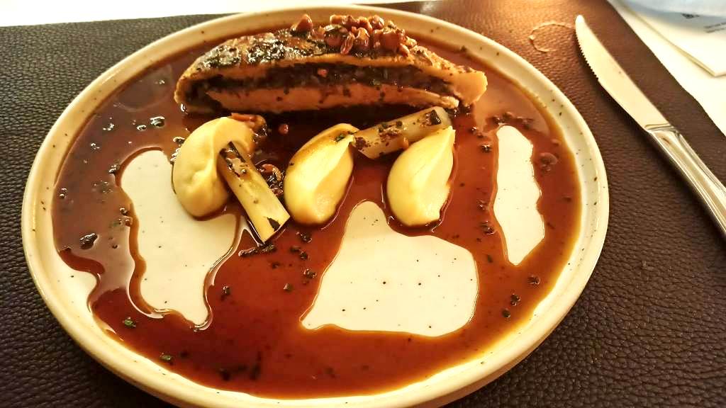 Στα κυρίως πιάτα επιλέξαμε αρχικά, με τη βοήθεια πάντα του ευγενέστατου προσωπικού, κοτόπουλο σωτέ γεμιστό με μανιτάρια και πουρέ από σελινόριζα, σάλτσα gravy, κάσιους, λαγόχορτο, λαχανικά εποχής και τραγανή πέτσα κοτόπουλου. Ένα ξεχωριστό πιάτο, με άψογα εκτελεσμένες τις απαιτητικές τεχνικές που το συνδημιουργούν.