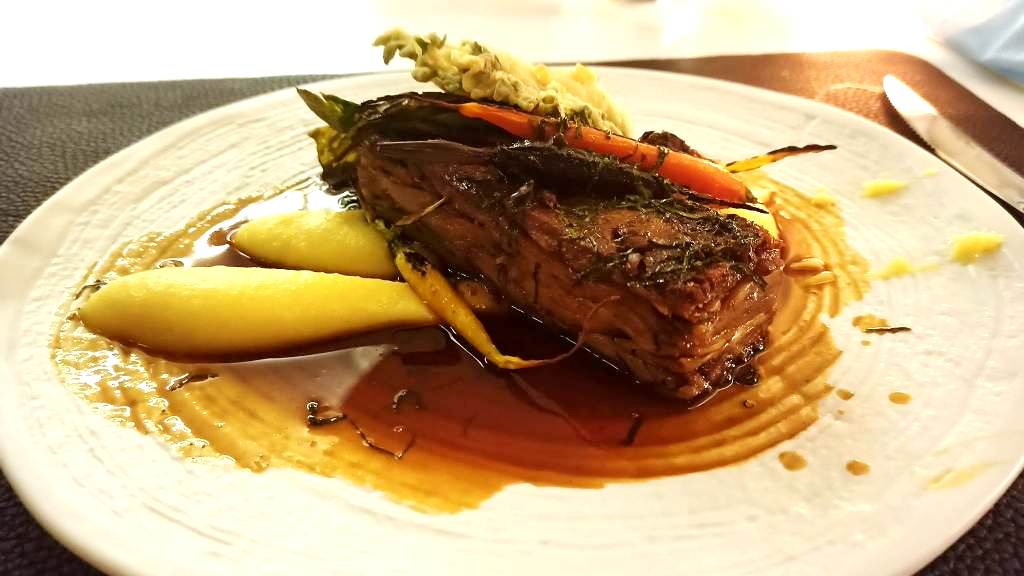 Ακολούθως έφθασε στο τραπέζι μας αρνίσιος λαιμός με πουρέ πατάτας και σκόρδο, σε ζωμό από αρνί με αντζούγιες, καρότα και ιαπωνική μέντα shiso τηγανισμένη με αλεύρι. Γεύσεις οικείες και αγαπημένες, με δημιουργική διάθεση αντιμετωπισμένες και σε μερίδες χορταστικές -όπως αδιάψευστα αποδεικνύει και η φωτογραφία- σερβιρισμένες.