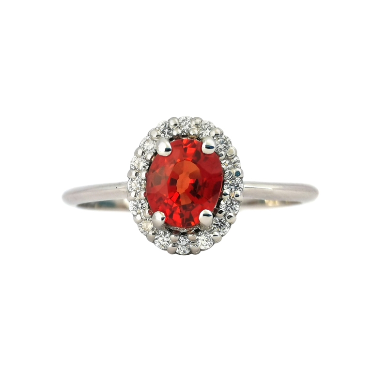 Μενταγιόν για παθιασμένες καρδιές, που ενώνουν την αντίθεση του κίτρινου και λευκού χρυσού για πάντα, σφίγγοντας στην αγκαλιά τους μια κόκκινη σπάνια πέτρα Σπεσαρτίνη Γρανάτη και Διαμάντια.
