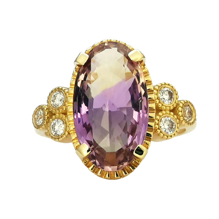 Η απόλυτη αρμονία που δίνει η Αμετρίνη, σε συνδυασμό με τη λάμψη της ψυχής που εκπέμπεται από τα διαμάντια που το αγκαλιάζουν. Η ιδανική επιλογή για πρόταση γάμου!