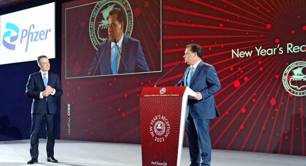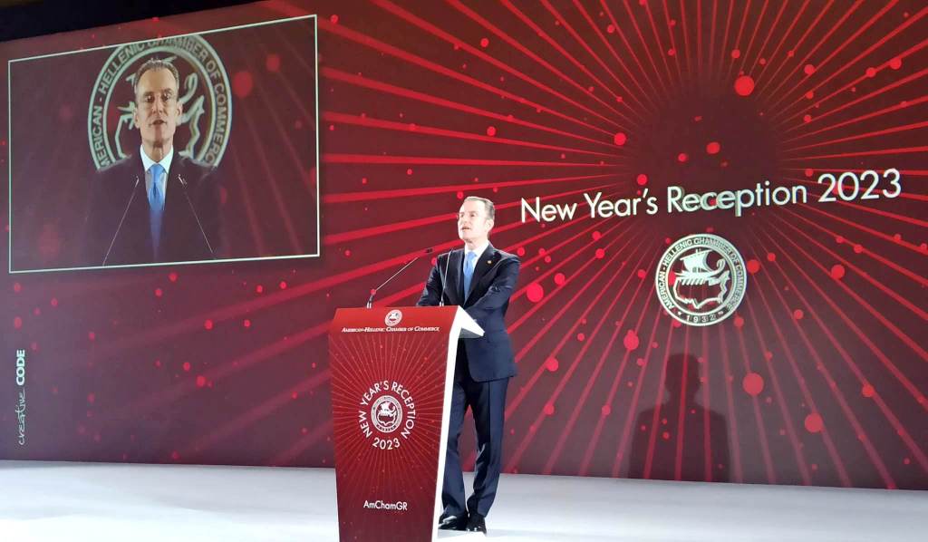 Με την παρουσία της Α.Ε. του Αμερικανού Πρέσβη στην Αθήνα Γεωργίου Τσούνη και του Υπουργού Ανάπτυξης και Επενδύσεων Άδωνι Γεωργιάδη, πραγματοποιήθηκε η κοπή της πρωτοχρονιάτικης πίτας του Ελληνοαμερικανικού Εμπορικού Επιμελητηρίου, στο πλαίσιο δεξίωσης που φιλοξενήθηκε στους χώρους του εμβληματικού ξενοδοχείου της Αθήνας Athenaeum Intercontinental, την Τρίτη 21 Φεβρουαρίου.