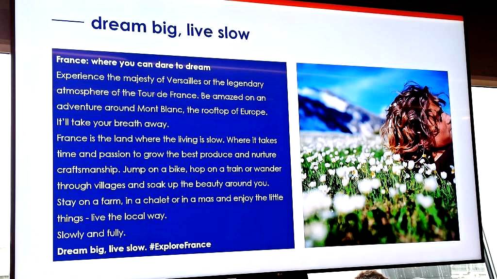 Η καμπάνια #ExploreFrance εξελίσσεται και επικεντρώνεται με άξονα την ποιότητα της πράσινης και αργής τουριστικής προσφοράς. Πάγια πρόκληση παραμένει το να επιβεβαιωθεί η βιώσιμη θέση του προορισμού και να ενθαρρυνθούν οι αναζωογονημένες ευρωπαϊκές τουριστικές ροές προωθώντας μια απροσδόκητη Γαλλία. Σύμφωνα με τη θεωρία του «Dream big, live slow«, οι πιο όμορφες ανοιξιάτικες και φθινοπωρινές προτάσεις θα ενισχύσουν τοποθεσίες και περιοχές, που ακόμα είναι λίγο μυστικές, έτσι ώστε οι επισκέπτες τους να τις βιώσουν με τρόπους που πρωτίστως σέβονται το περιβάλλον. Με άλλα λόγια, η Γαλλία μας προ(σ)καλεί να αφήσουμε τον εαυτό μας ελεύθερο να επιλέξει μία αυθεντική και ουσιαστική ανακάλυψη χωριών, χειροτεχνιών, τοπικής γαστρονομίας και ατμόσφαιρας, δίνοντάς του τον χρόνο να τα γευθεί όλα αυτά!