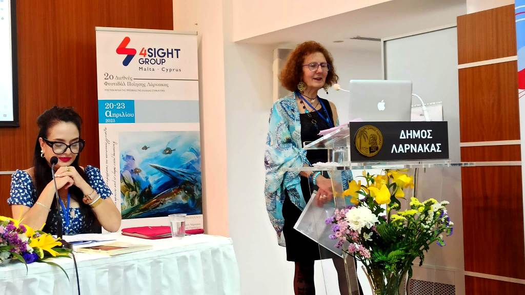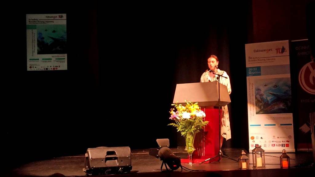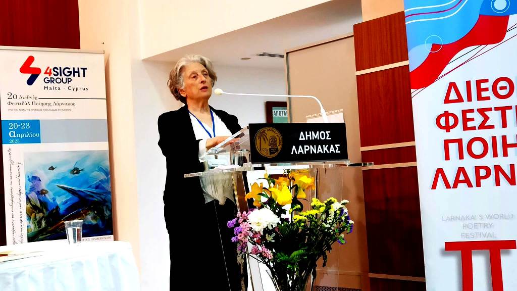 Το πρωί της κυριακής 23 Απριλίου, στον Πολυδύναμο Πολυχώρο Κοινωνικής Πρόνοιας και Απασχόλησης του Δήμου Λάρνακας φιλοξενήθηκε η τελευταία, αλλά διόλου λιγότερο σημαντική και ενδιαφέρουσα -το αντίθετο μάλιστα- εκδήλωση του 2ου Διεθνούς Φεστιβάλ Ποίησης Λάρνακας. Πέραν των εξαιρετικών απαγγελιών το πολυπληθές ακροατήριο είχε την ευκαιρία να απολαύσει μία μοναδική συζήτηση στο πλαίσιο της στρογγυλής τράπεζας με θέμα «Η μελοποιημένη ποίηση», μέρος της οποίας περιλαμβάνεται στο ακόλουθο video, με την τοποθέτηση της πάντα καθηλωτικής -με τον πεζό ή έμμετρο λόγο της- Λίνας Νικολακοπούλου.