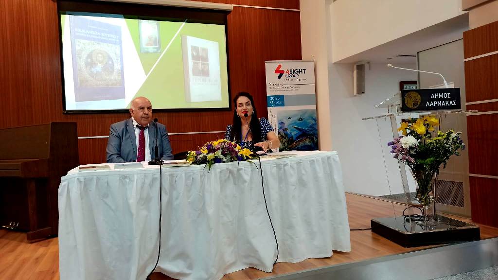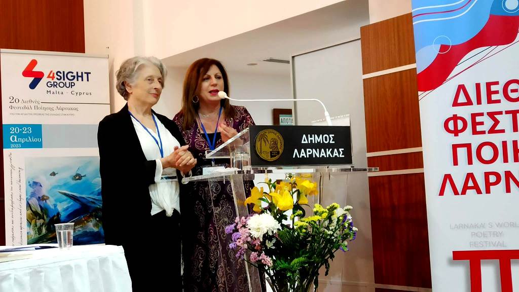 Ο Πρόεδρος των Διεθνών Φεστιβάλ Ποίησης Πάτρας και Λάρνακας Καθηγητής Τριαντάφυλλος Η. Κωτόπουλος και η Ελένη Αρτεμίου-Φωτιάδου, Καλλιτεχνική Διευθύντρια, Πρόεδρος της Οργανωτικής Επιτροπής και Μέλος της Επιστημονικής Επιτροπής του Διεθνούς Φεστιβάλ Ποίησης Λάρνακας.