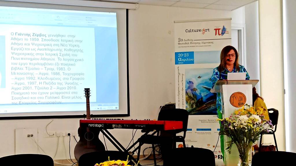 Ακολούθησε το αφιέρωμα στον ποιητή Γιάννη Ζέρβα, με την Ελένη Αρτεμίου – Φωτιάδου να διαβάζει την παρουσίαση του Κώστα Κρεμμύδα, λόγω απουσίας του.