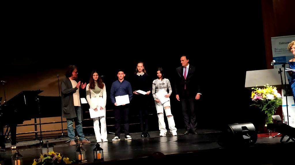 Η Α.Ε. ο Πρέσβης της Ελλάδας στην Κύπρο Ιωάννης Παπαμελετίου και ο ποιητής Κώστας Κρεμμύδας βραβεύουν τους διακριθέντες μαθητές Γυμνασίου.