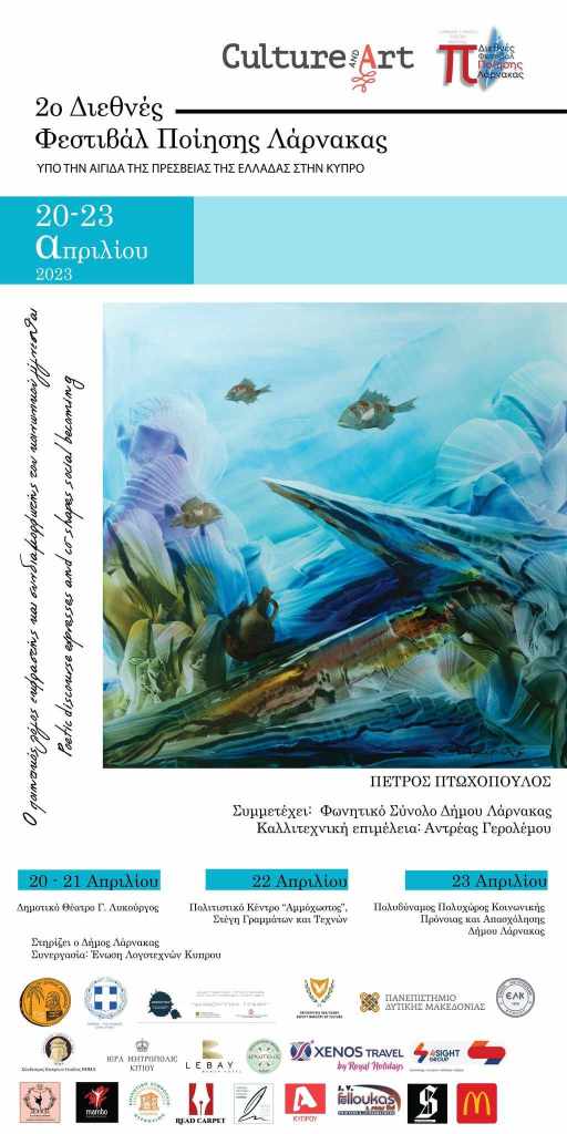 Το 2ο Διεθνές Φεστιβάλ Ποίησης Λάρνακας πραγματοποιήθηκε στην πανέμορφη αυτή πόλη της Κύπρου από την Πέμπτη 20 έως και την Κυριακή 23 Απριλίου, ως μία τετραήμερη γιορτή πολιτισμού με τίτλο: «Ο ποιητικός λόγος εκφραστής και συνδιαμορφωτής του κοινωνικού γίγνεσθαι». Το Φεστιβάλ, έχοντας πλέον τοποθετήσει επάξια τη Λάρνακα και ολόκληρη την Κύπρο στο επίκεντρο του διεθνούς περί ποίησης ενδιαφέροντος, διοργανώθηκε από την Culture & Αrt, τελούσε υπό την αιγίδα της Πρεσβείας της Ελλάδας στην Κύπρο, στηρίχθηκε δε από τον Δήμο Λάρνακας, ενώ η διοργάνωση χαιρέτησε φέτος και τη συνεργασία της με την Ένωση Λογοτεχνών Κύπρου. Η Λάρνακα, μέσω αυτού του Φεστιβάλ-θεσμού, πέτυχε να σηματοδοτήσει τον φυσικό, αλλά και διαδικτυακό εκείνο χώρο -μέσω και της ιστοσελίδας cultureandart.cy-, που όχι μόνο θα συμβάλει στη σύσφιξη σχέσεων και στην καλλιέργεια της πολιτιστικής διπλωματίας, αλλά και θα αποτελέσει διεθνή κόμβο προώθησης, σταδιακά, των καλών πρακτικών στην εκπαίδευση και την καλλιέργεια ευτυχισμένων αυριανών πολιτών, κριτικά σκεπτόμενων, με αναπτυγμένη την πολιτιστική συνείδηση και την κοινωνική ενσυναίσθηση. Η αδιαμφισβήτητη επιτυχία του 2ου Διεθνούς Φεστιβάλ Ποίησης Λάρνακας αποδεικνύεται, από αυτό που τόνισε σε συνέντευξη που μας παραχώρησε ο Πρόεδρός του Δρ Τριαντάφυλλος Η. Κωτόπουλος: «Νομίζω ότι η καλύτερη απόδειξη της επιτυχίας του Φεστιβάλ ήταν τα ασφυκτικά γεμάτα αμφιθέατρα, άρα η παρουσία του κόσμου, καθώς και το βροντερό παρόν που έδωσε η εκπαιδευτική κοινότητα και ο μαθητικός πληθυσμός».