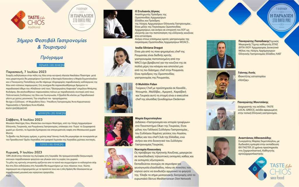 Μια μεγάλη, λοιπόν, γιορτή Γεύσης και Παράδοσης με ζωντανή μαγειρική από δημοφιλείς και διακεκριμένους chefs, γευσιγνωσίες, πληροφορίες για παραδοσιακές καλλιέργειες, δρώμενα και παραδοσιακό γλέντι, θα έχουν την ευκαιρία να παρακολουθήσουν όσοι βρεθούν στο γοητευτικό νησί της μαστίχας αυτό το τριήμερο, 7-9 Ιουλίου. Ο Σύλλογος «Η Μυρωδάτη Χίος» θα δώσει και πάλι το δυναμικό παρών του στα γαστρονομικά δρώμενα του νησιού, με έμπνευση, μεράκι, γνώση και αγάπη όπως πάντα, αλλά υπό την ομπρέλα αυτή τη φορά του Φορέα Τουρισμού Χίου, η οποία καλύπτει και όλους τους λοιπούς συμμετέχοντες στη διοργάνωση Συλλόγους-Μέλη του Φορέα, οι οποίοι είναι: o Φιλοπρόοδος Όμιλος Καρδαμύλων, ο Προοδευτικός Όμιλος Λαγκάδας, ο Σύλλογος Φρουρίου «Άγιος Γεώργιος», ο Εκπολιτιστικός & Αθλητικός Σύλλογος Νενήτων «Βοκαριά», η Διεθνής Ένωση Αστυνομικών/Τοπική Διοίκηση Χίου, ο Πολιτιστικός και Λαογραφικός Σύλλογος Οινουσσών «Οινόεσσα», ο Εκπολιτιστικός Σύλλογος Πιτυούς «Ο Μάκελλος», ο Πολιτιστικός Σύλλογος «Τέχνη εν Δράσει», ο Μορφωτικός Σύνδεσμος Βαρβασίου Χίου Βιβλιοθήκη «Ο Φάρος», ο Πολιτιστικός Σύλλογος Μεστών, ο Μορφωτικός Σύλλογος Αγίου Γεωργίου Συκούση, ο Πολιτιστικός Σύλλογος Λαγκάδας «Η Κυδιάντα», ο Πολιτιστικός Επιμορφωτικός Σύλλογος Νεοχωρίου «Άγιος Μηνάς», το Επιμελητείον Περιβάλλοντος και Πολιτισμού Χίου ΕΠΠΟΧΙ, ο Μορφωτικός Σύλλογος Πυργίου «Γεώργιος Θεοτοκάς», ο Πολιτιστικός Σύλλογος Κοινής.