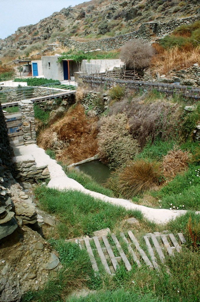 Οι σκάλες που βρίσκονταν στα υψηλότερα επίπεδα διέθεταν, συνήθως, δικό τους πηγάδι για την άρδευσή τους. Αυτές όμως που βρίσκονταν χαμηλότερα εκμεταλλεύονταν το νερό του πηγαδιού της περιοχής, το οποίο ήταν «βρυσικό», όπως ονομάζουν οι ντόπιοι το νερό που αναβλύζει μόνο του από τη γη. Αυτός, άλλωστε, ήταν και ο κυριότερος λόγος, που οι σκάλες δημιουργήθηκαν εκεί και όχι κάπου αλλού. Η αφθονία του νερού ήταν σημαντική συγκρινόμενη πάντοτε με τα δεδομένα του ίδιου του νησιού, το οποίο διαχρονικά χαρακτηρίζεται από ανομβρία και έλλειψη τρεχούμενων υδάτων. Η σχετική αυτή αφθονία αποτυπώνεται και στο τοπωνύμιο Βάλσαμος ή Βάρσαμος, μιας και η θέα του πράσινου και του νερού δημιουργεί πάντοτε αγαλλίαση (βάλσαμο) στην ανθρώπινη ψυχή. Γύρω από το εν λόγω πηγάδι, το οποίο περιέβαλαν οι σκάλες, βρισκόταν μια «χαβούζα», μια μεγάλη ανοιχτή στέρνα, ονομασία η οποία προφανώς παραπέμπει στην τουρκική λέξη havuz, που σημαίνει πισίνα. Μόλις το πηγάδι γέμιζε αυτός που ήθελε να ποτίσει τη σκάλα του, «ξαγκλούσε» το νερό του, δηλαδή με μία «σύγκλα» (=ένα μεταλλικό δοχείο δεμένο με σχοινί) το τραβούσε -το «ανέσυρνε» όπως λένε στην Φολέγανδρο- και το έριχνε στην ανοιχτή «χαβούζα» μέχρι να τη γεμίσει. Σε ορισμένες τοποθεσίες, όπως στο Βάρσαμο, το νερό ανέβρυζε απευθείας μέσα στην «χαβούζα», η οποία σε κάθε περίπτωση συνδεόταν με τις σκάλες χάρη σ’ ένα πολύπλοκο σύστημα αυλακιών. Η τοποθέτηση μικρών πετρών, μπηγμένων κάθετα στο έδαφος, λειτουργούσε ως μικροσκοπικό ανασχετικό φράγμα και οδηγούσε το νερό προς μία συγκεκριμένη σκάλα, μη αφήνοντάς το να διαχυθεί προς λάθος κατευθύνσεις. Το κεντρικό αυλάκι κάθε σκάλας διακλαδιζόταν σε πολλά μικρότερα και ο έμπειρος ιδιοκτήτης της δεν είχε παρά να τοποθετήσει τις πέτρες-φράγματα με τέτοιο τρόπο, ώστε το νερό να φθάσει και να ποτίσει και την τελευταία άκρη του μικροσκοπικού κήπου του, της μοναδικής ποτιστικής έκτασης που διέθετε η κάθε οικογένεια.