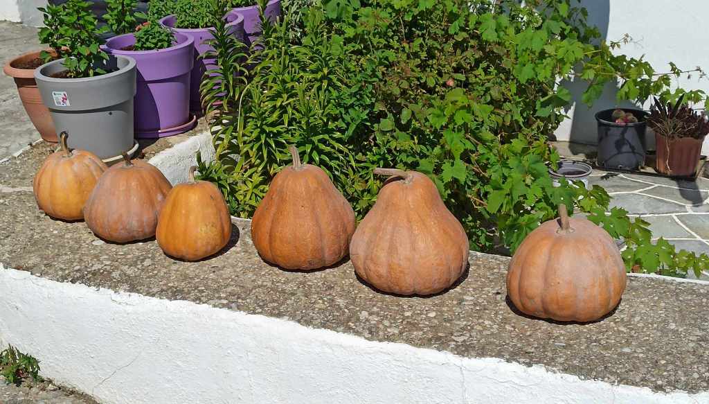 Οι μικροί αυτοί λαχανόκηποι δεν είναι άλλοι από τις γνωστές σήμερα «σκάλες», που εξακολουθούν να βρίσκονται στις ίδιες αυτές τοποθεσίες της Άνω Μεριάς, όπου και κατεγράφησαν από τους προαναφερθέντες συγγραφείς πριν από σχεδόν ενάμιση αιώνα. Κάθε ανωμερίτικη οικογένεια έπρεπε απαραιτήτως να διαθέτει τη σκάλα της προκειμένου να εξασφαλίσει την κάλυψη των αναγκών της σε εποχικά λαχανικά και όχι μόνο. Ανάλογα, λοιπόν, με την εποχή ο επισκέπτης της σκάλας μπορούσε να την δει φυτεμένη με ντομάτες, πατάτες, μελιτζάνες, πιπεριές, φασολάκια, κρομμύδια, κουνουπίδια, «κουβαρωτά» (δηλ. λάχανα), μπάμιες, μαρούλια, κίτρινες κολοκύθες και βεβαίως νεροκολοκύθες, τα γνωστά στο φολεγανδρίτικο ιδίωμα φλασκιά και κρατούνια. Το πόσο σημαντικές ήταν αυτές οι νεροκολοκύθες στην καθημερινή ζωή των Φολεγανδρίων, αποδεικνύεται από την ευρύτητα, αλλά και την ευρηματικότητα της χρήσης τους, που τις μετέτρεπε σε δοχεία μεταφοράς νερού (παγούρια) ή άλλων υγρών, καθώς επίσης και σε κατσαρολάκια, κύπελα (ποτήρια) ή και σε σκεύη αποθήκευσης μικρόκαρπων προϊόντων, όπως οι ελιές. Η ελαφρότητα και η ταυτόχρονη ανθεκτικότητα του ξυλώδους κελύφους των διαφόρων ειδών νεροκολοκύθας ευθύνεται κυρίως για τη δημοφιλία τους αυτή, την οποία κατάφερε να εκτοπίσει μόνο η έλευση του πλαστικού. Τέλος, στη σκάλα της η κάθε οικογένεια φύτευε και από μία ρίζα διαφόρων οπωροφόρων δένδρων: μια κυδωνιά, μια ροδιά, μια ροδακινιά, μια αμυγδαλιά… Απ’ όλα κι από λίγο, αυτή ήταν η φιλοσοφία του Φολεγανδρίτη, που του την επέβαλε ο ίδιος ο τόπος!