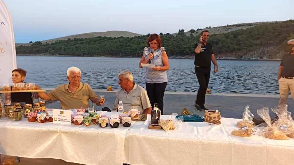 Πολλοί και αυτή τη βραδιά οι πάγκοι ντόπιων παραγωγών, που έχουν στηθεί εδώ διαθέτοντας από τοπικά τυριά, μέλι και μαρμελάδες, έως προϊόντα τριαντάφυλλου από τον Άγιο Γεώργιο Συκούση.