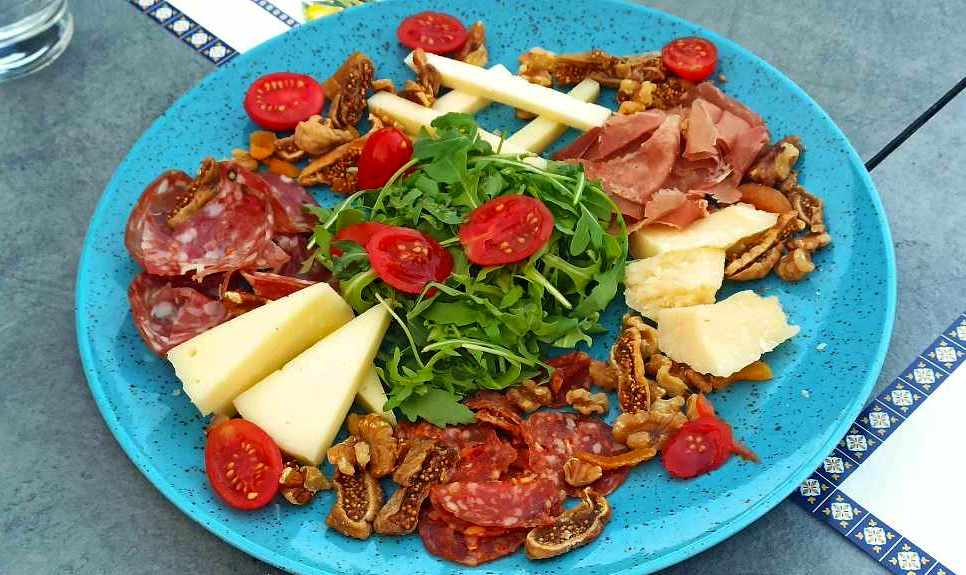 …και ποικιλία τυριών κι αλλαντικών με ρόκα και ντοματούλα, με το πιάτο να παραπέμπει στα χρώματα της ιταλικής tricolore!