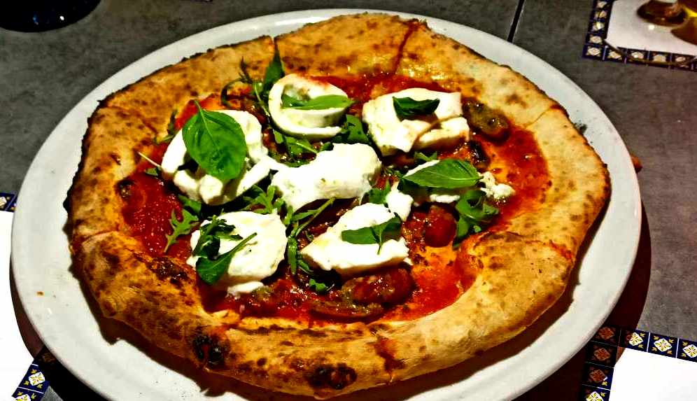 Στη συνέχεια, η ζύμη ωριμάζει για 12-24 ώρες προτού κάνει την είσοδό της στον χαρακτηριστικό κόκκινο ξυλόφουρνο, κατασκευασμένο στην Νάπολη με τούβλα από τον Βεζούβιο. Έπειτα από λίγα λεπτά και κάποιες προσεγμένες στροφές μπροστά από τη φωτιά, η pizza φτάνει σε κάθε τραπέζι κομμένη στα τέσσερα, όπως δηλαδή συνηθίζουν να τη σερβίρουν οι Ναπολιτάνοι!