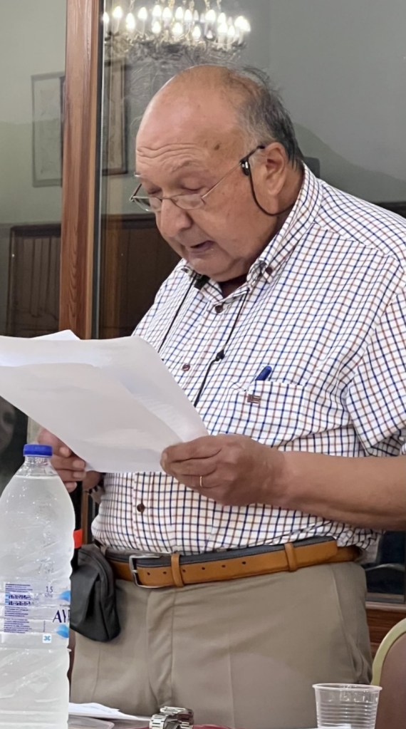 Ο Μηνάς Αλ. Αλεξιάδης, ένας από τους σημαντικότερους σύγχρονους Λαογράφους για την Ελλάδα και την Ευρώπη, ξεκίνησε την ομιλία του τονίζοντας: «Το ‘αδελφικός φίλος’ μου άρεσε περισσότερο απ’ όλα, είμαστε φίλοι από το 1960». Ο Μηνάς Αλ. Αλεξιάδης συνέχισε υπογραμμίζοντας: «Η σημερινή εκδήλωση είναι οφειλόμενη τιμή σε έναν ακάματο ερευνητή της Καρπαθιακής Λαογραφίας, εξέχοντα λαϊκό ποιητή της Καρπάθου και Πρόεδρο του Κεντρικού Παραρτήματος του Ινστιτούτου Λαϊκού Πολιτισμού της Καρπάθου, πρώην Αντιπρόεδρο του Καρπαθιακού Οργανισμού Πολιτισμού Άθλησης Παιδείας (Κ.Ο.Π.Α.Π.) και μέλος πολλών Καρπαθιακών Συλλόγων. Το τεράστιο έργο του δεν θα μπορούσε να περάσει απαρατήρητο, γι’ αυτό και ο ομιλών εισηγήθηκε στον Τομέα Βυζαντινής Φιλολογίας και Λαογραφίας του Τμήματος Φιλολογίας της Φιλοσοφικής Σχολής του Εθνικού και Καποδιστριακού Πανεπιστημίου Αθηνών (Ε.Κ.Π.Α.) να μελετηθεί το έργο του σε ειδική πολυσέλιδη μονογραφία, η οποία ανατέθηκε στην άριστη Μεταπτυχιακή φοιτήτριά μου Κατερίνα Ελ. Μαρινάκη, από τη Φολέγανδρο των Κυκλάδων. Η κυρία Μαρινάκη ολοκλήρωσε το έργο αυτό μελετώντας περισσότερες από 8.000 μαντινάδες του Ηλία Εμμ. Βασιλαρά και θα λάβει το Μεταπτυχιακό Δίπλωμα Master πριν το τέλος του 2023. Τίτλος του βιβλίου της, που αποτελείται από σχεδόν 550 σελίδες, είναι: ‘Ηλίας Εμμ. Βασιλαράς, ένας σύγχρονος λαϊκός ποιητής της Καρπάθου‘. Με βάση το βιβλίο αυτό και τα πολλά άλλα δημοσιεύματα του Ηλία Βασιλαρά, αλλά και τις συναφείς δραστηριότητές του, οι Καθηγητές της Διοικούσας Επιτροπής του Ινστιτούτου Λαϊκού Πολιτισμού Καρπάθου αποφάσισαν να του απονείμουν τον τίτλο του Επιστημονικού Συνεργάτη του Ινστιτούτου, τίτλο που με προθυμία συνυπέγραψε και ο Δήμαρχος Καρπάθου. Ο τίτλος τού απονέμεται επαξίως και δικαίως, διότι αν και δεν διαθέτει Πανεπιστημιακό Πτυχίο, η ομόφωνη απόφαση των Καθηγητών του Ινστιτούτου Λαϊκού Πολιτισμού Καρπάθου, η υπογραφή των Πρυτανικών Αρχών του Ε.Κ.Π.Α. και η άποψη δύο ειδικών Ακαδημαϊκών, Τακτικών Μελών της Ακαδημίας Αθηνών, υπαγορεύει το αυτονόητο. Άλλωστε, η λέξη επιστημονικό, όπως όλοι γνωρίζουμε, προέρχεται από το ρήμα επίσταμαι, που σημαίνει γνωρίζω καλά και ο Ηλίας Βασιλαράς γνωρίζει άριστα τον λαϊκό πολιτισμό της Καρπάθου και ο ίδιος είναι δημιουργός Λαογραφικής Θεματικής». Ακολούθησε η συνοπτική παρουσίαση της εκτεταμένης Εργογραφίας του Ηλία Εμμ. Βασιλαρά, μέρος της οποίας παρατίθεται στο τέλος του άρθρου. Μάλιστα, ο κ. Αλεξιάδης τόνισε ότι η μονογραφία για τα Σπόα είναι η μοναδική που έχει γραφεί για χωριό της Καρπάθου.
