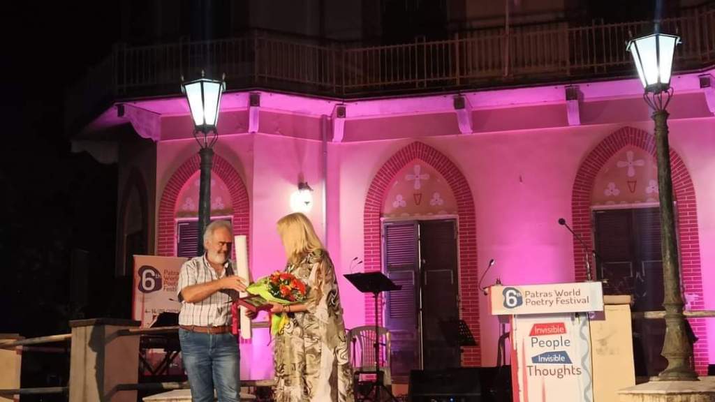 …ενώ αμέσως μετά την ολοκλήρωση των σύντομων χαιρετισμών, ξεκινούν οι Τιμητικές διακρίσεις προς τους Χορηγούς και Υποστηρικτές του Διεθνούς Φεστιβάλ Ποίησης Πάτρας, με πρώτη να παραλαμβάνει την Τιμητική Πλακέτα, τη συλλεκτική αφίσα και την ανθοδέσμη της, η Υπεύθυνη του Ιδρύματος Ελληνική Διασπορά Ξανθή Παναγιωτοπούλου. Της τα επέδωσε ο Πρύτανης του Πανεπιστημίου Πατρών Χρήστος Μπούρας…