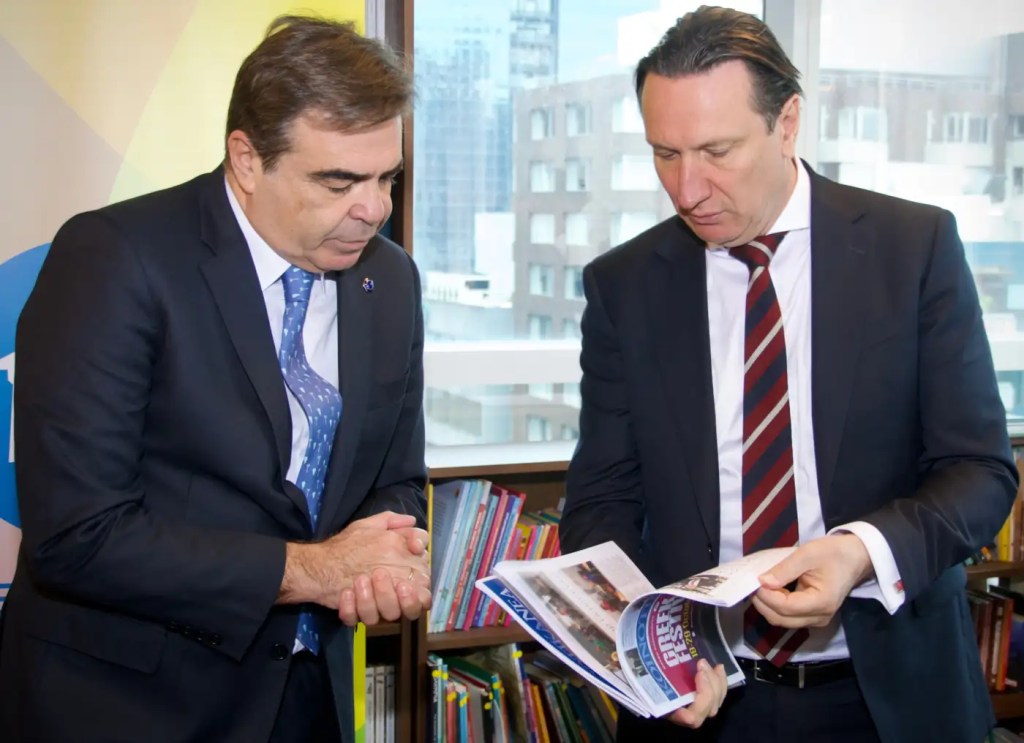 Ο Μαργαρίτης Σχοινάς περιηγήθηκε στο Ελληνικό Κέντρο και του παρουσιάστηκε μια επισκόπηση των πολιτιστικών και εκπαιδευτικών δραστηριοτήτων της Ε.Κ.Μ. Ο Βασίλης Παπαστεργιάδης τόνισε στον κ. Σχοινά τη σημασία της διατήρησης της ελληνικής κληρονομιάς στη διασπορά, καθώς και την εξέλιξη της Ε.Κ.Μ., η οποία έχει καταστεί ένας δυναμικός πυρήνας για την έκφραση του ελληνικού πολιτισμού, με πάνω από 100 εκδηλώσεις ετησίως. Ο κ. Παπαστεργιάδης δήλωσε συγκεκριμένα: “Η Μελβούρνη είναι μία κοσμοπολίτικη πόλη και αποτελεί ένα πρωτοποριακό παράδειγμα του πώς η πολυπολιτισμικότητα υποστηρίζεται για την επίτευξη κοινωνικών αποτελεσμάτων. Ως μέρος του ρόλου σας, κ. Σχοινά, στην ηγεσία της προώθησης του ‘Ευρωπαϊκού Τρόπου Ζωής‘, το έργο μας στη Μελβούρνη μπορεί και πρέπει να χρησιμοποιηθεί ως μάθημα, σχετικά με το πώς διάφορες Κοινότητες μπορούν να ενωθούν και να συνεργαστούν”.