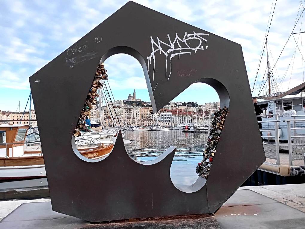 Στη φωτογραφία η Notre-Dame de la Garde, όπως φαίνεται μέσα από το «Μ», το σήμα κατατεθέν της πόλης.