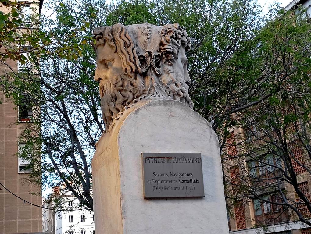 Tο άγαλμα του Πυθέα μαζί με εκείνο του Ευθυμένη. H παρουσία τους στο συγκεκριμένο σημείο μόνο τυχαία δεν είναι καθώς οι δύο Έλληνες θαλασσοπόροι από τη Μασσαλία βοήθησαν το άνοιγμα του εμπορίου σε μια πόλη, που κάποτε ήλεγχε μεγάλο μέρος της μεσογειακής οικονομίας. Ο Ευθυμένης ταξίδεψε προς τον Νότο φθάνοντας ως τη Σενεγάλη, πιθανόν και τη Γκάνα, ενώ ο Πυθέας τράβηξε προς Βορράν.