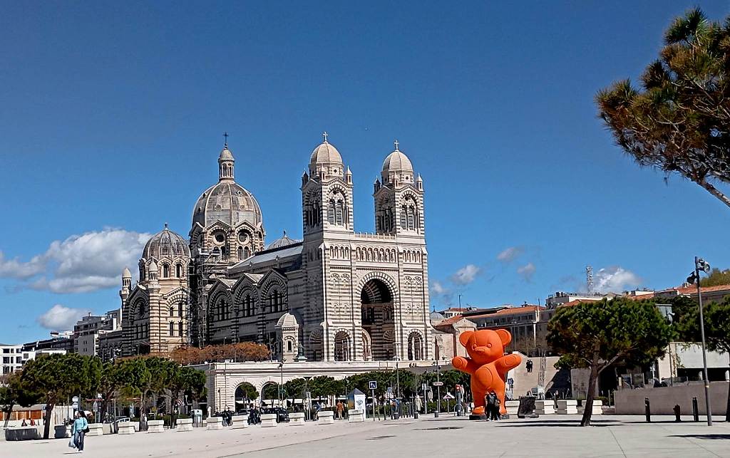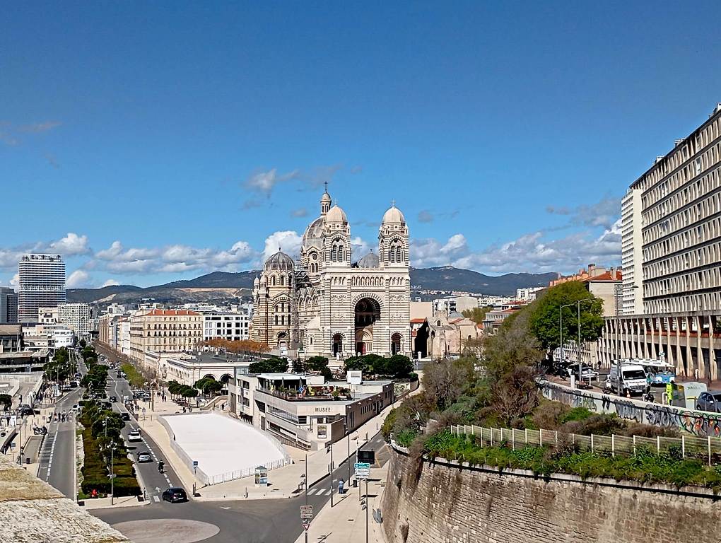 Ο Καθεδρικός σε εντυπωσιακή φωτογραφική συνύπαρξη με το Cosquer Méditerranée, όπου στεγάζεται ένα αντίγραφο του σπηλαίου Cosquer, το οποίο ανακαλύφθηκε το 1985 στους κολπίσκους της Μασσαλίας, από τον δύτη Henri Cosquer, προς τιμήν του οποίου και ονοματοδοτήθηκε.