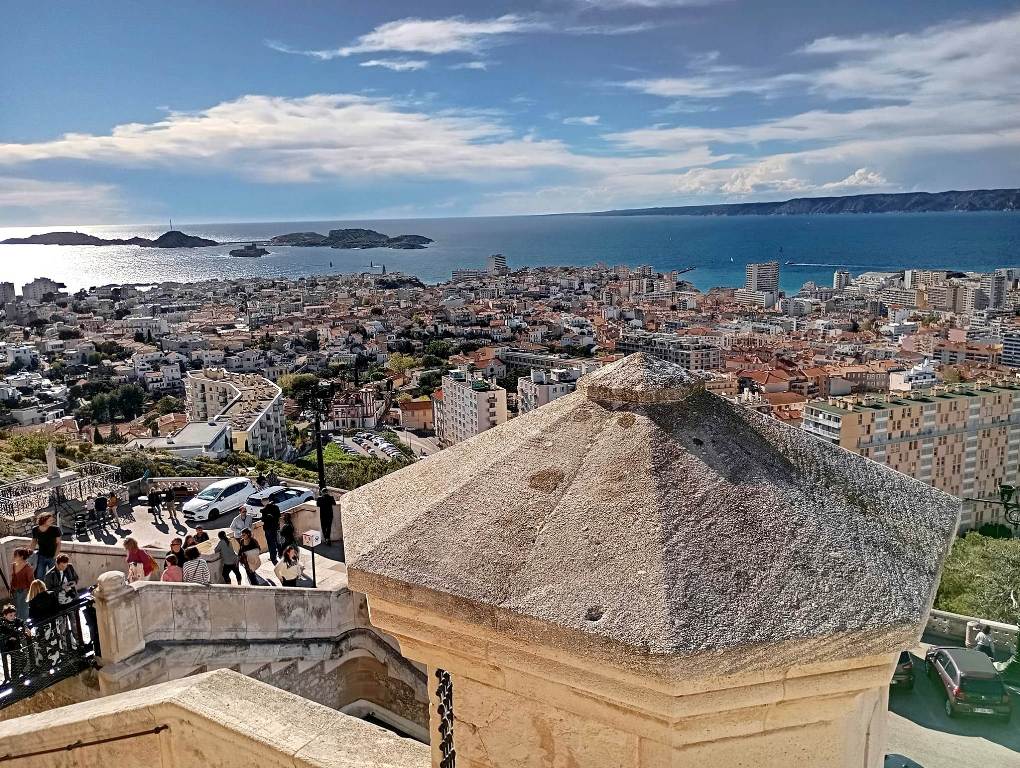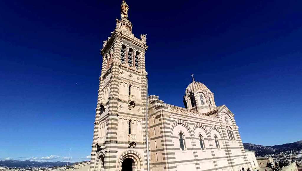 O εντυπωσιακός ναός της Notre-Dame de la Garde (στο βάθος) ή «La Bonne Mère» (η Καλή Μητέρα), είναι ορατός σχεδόν από κάθε σημείο της πόλης.
