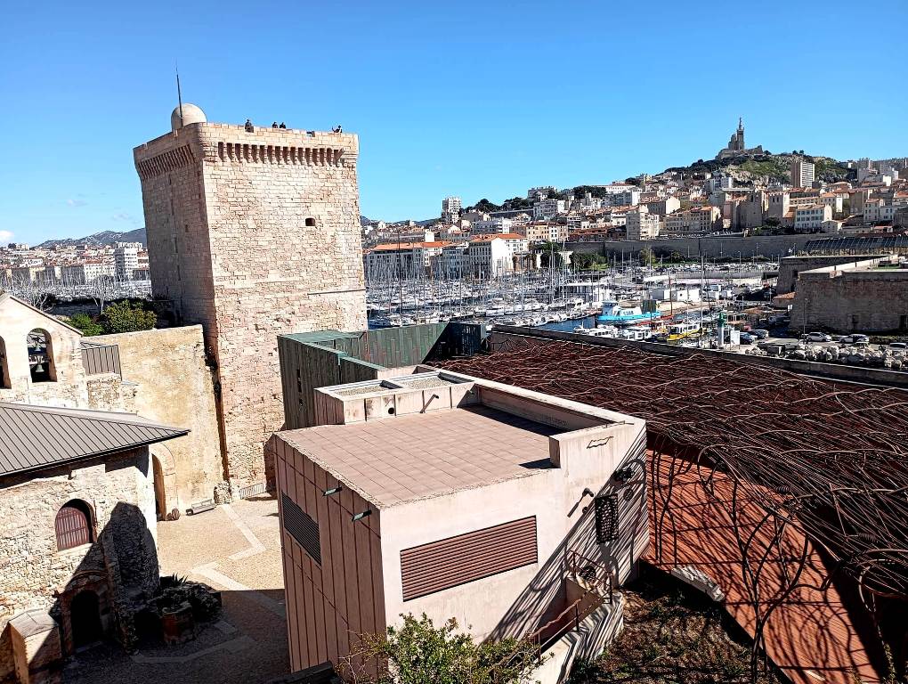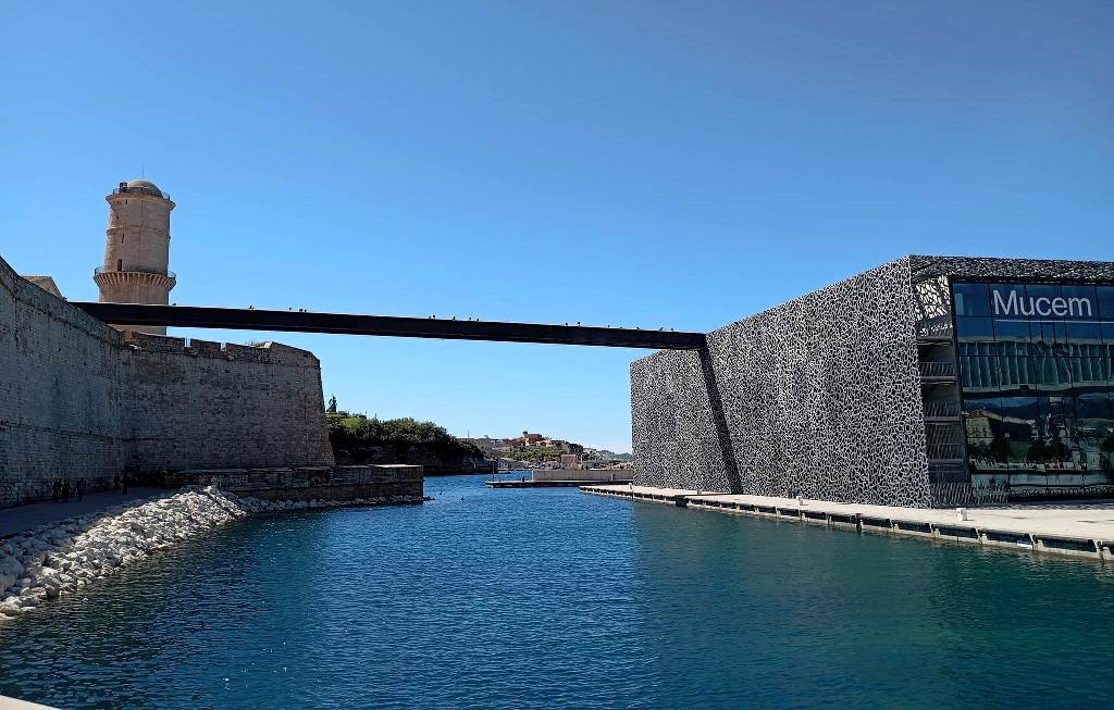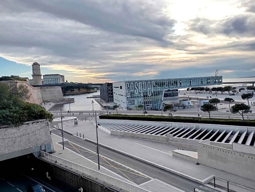 Πανοραμική άποψη ενός από τα χαρακτηριστικότερα αστικά τοπία της Μασσαλίας. Αριστερά, το Φρούριο Saint Jean και ο Πύργος Fanal, που αποτελούν αναπόσπαστο μέρος του ΜuCEM, του εμβληματικού Μουσείου Ευρωπαϊκών και Μεσογειακών Πολιτισμών. Σε πρώτο πλάνο το επίσης εντυπωσιακό Cosquer Méditerranée, ο νέος πολιτιστικός χώρος της Μασσαλίας, που άνοιξε τις πύλες του στο κοινό τον Ιούνιο του 2022, στη Villa Méditerranée, ακριβώς δίπλα στο MuCEM.