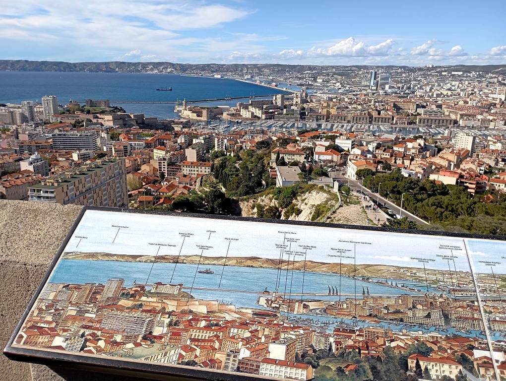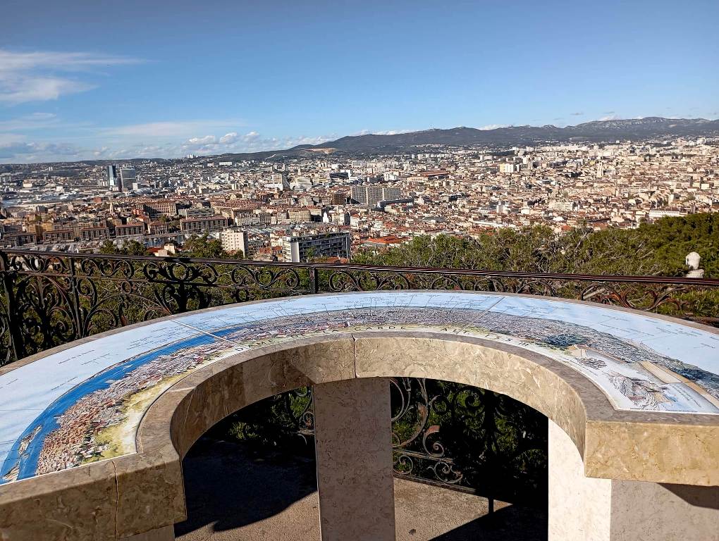Το πανόραμα της Μασσαλίας ζωντανά μπροστά στα έκθαμβα μάτια μας, αλλά και αποτυπωμένο στις ειδικές κατασκευές, που βρίσκονται τοποθετημένες σε νευραλγικά σημεία πέριξ του ναού.