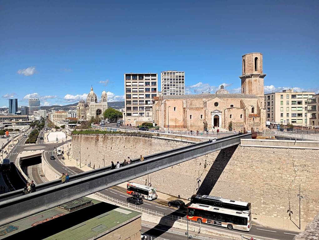 Πάνω από την πεζογέφυρα, η θέα προς τον Καθεδρικό ναό της Μασσαλίας είναι πραγματικά ανεπανάληπτη.