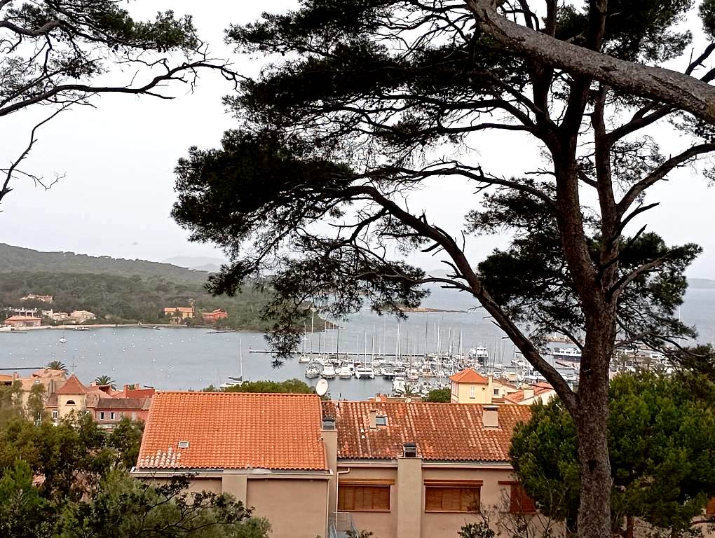 Μια πανοραμική άποψη του μικρού οικισμού στο Porquerolles, με το Φρούριο Sainte-Agathe να δεσπόζει στην κορυφή του χαμηλού λόφου.