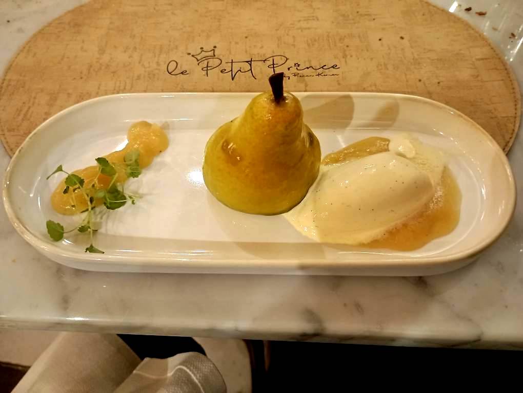 Για επιδόρπιο δοκιμάσαμε αχλάδι με παγωτό βανίλια και gel αχλαδιού, ενώ εξαιρετικό είναι και το παρφέ που σερβίρεται εδώ. Τέλος, μην χάσετε την ευκαιρία να παραγγείλετε ρούμι, αλλά και καφέ.