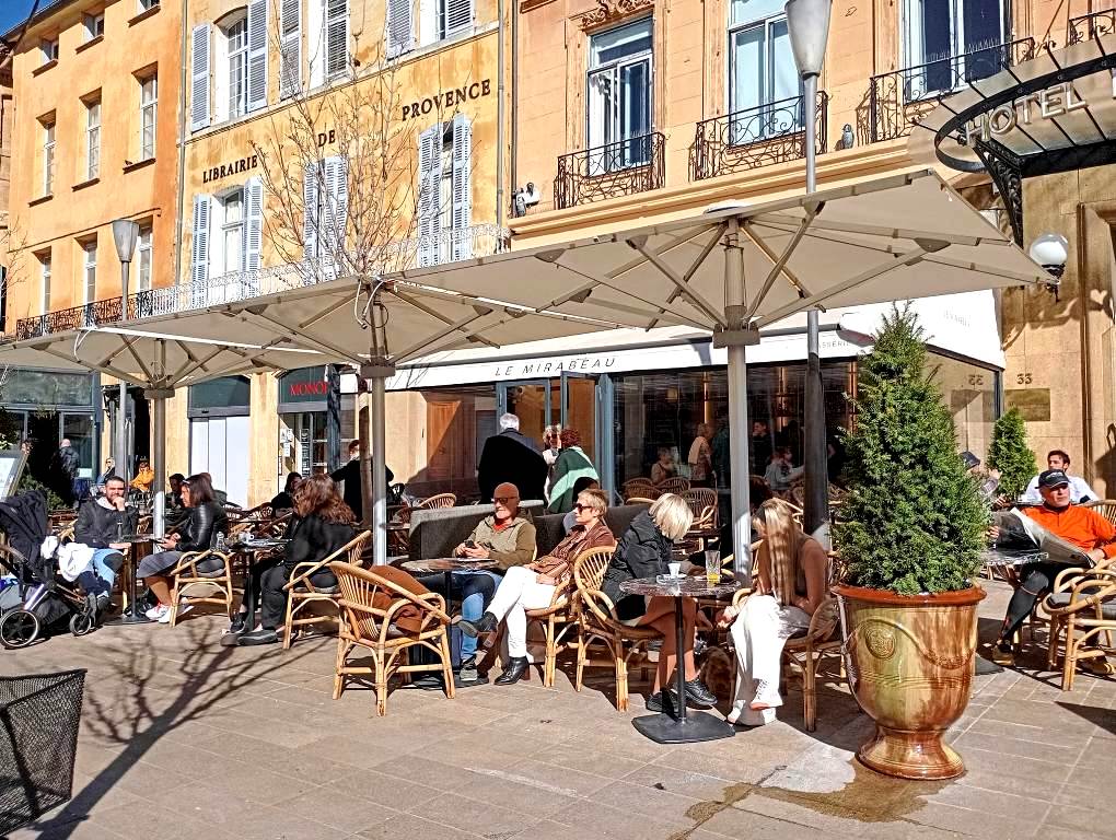 Ανάμεσα στα πολλά συντριβάνια, σήμα κατατεθέν της πόλης αποτελεί το εντυπωσιακό Fontaine de la Rotonde, στην ομώνυμη πλατεία de la Rotonde, που κοσμείται με τρία αγάλματα, τα οποία συμβολίζουν τη Δικαιοσύνη, τη Γεωργία και τις Καλές τέχνες. Από εδώ ακριβώς ξεκινά -ή καταλήγει αν προτιμάτε- ένας από τους ωραιότερους δρόμους που έχουμε δει σε ευρωπαϊκή πόλη, η οδός Mirabeau, ένας φαρδύς πεζόδρομος, με δύο σειρές πανύψηλα πλατάνια να οριοθετούν τις δύο πλευρές του, οι οποίες φιλοξενούν -όπως και τα δαιδαλώδη πλακόστρωτα δρομάκια που εξακτινώνονται γύρω τους- πολυτελή café, bistrot και ζαχαροπλαστεία, αλλά και μπουτίκ μερικών από τους ακριβότερους οίκους μόδας, δικαιολογώντας απολύτως το γιατί ο δρόμος αυτός αποτελεί εδώ και δύο αιώνες τόπο καθημερινής συνάντησης επισκεπτών και κατοίκων της Aix.