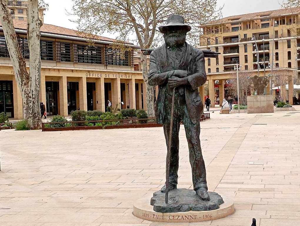 Το χάλκινο άγαλμα του Paul Cézanne, στην Place de la Rotonde και πολύ κοντά στο Τουριστικό Γραφείο της Aix, που διακρίνεται πίσω του, αποτελεί έργο του Gabriel Sterk και προσφέρθηκε στην πόλη το 2006 από την Ένωση Aix-en-Oeuvres.
