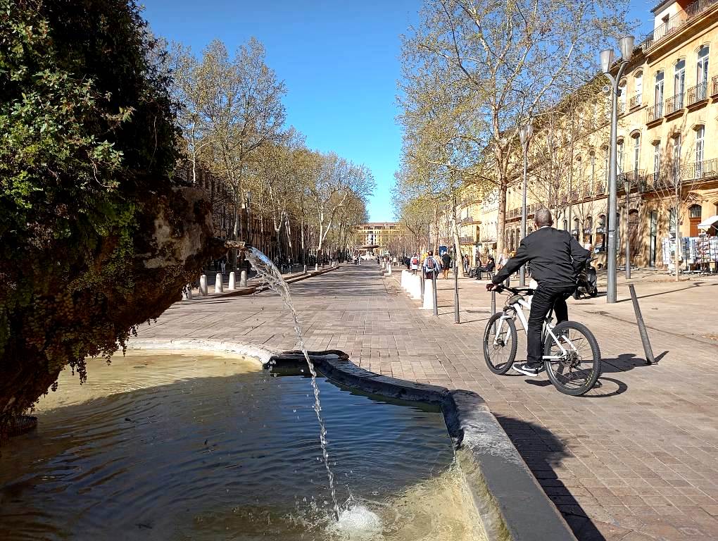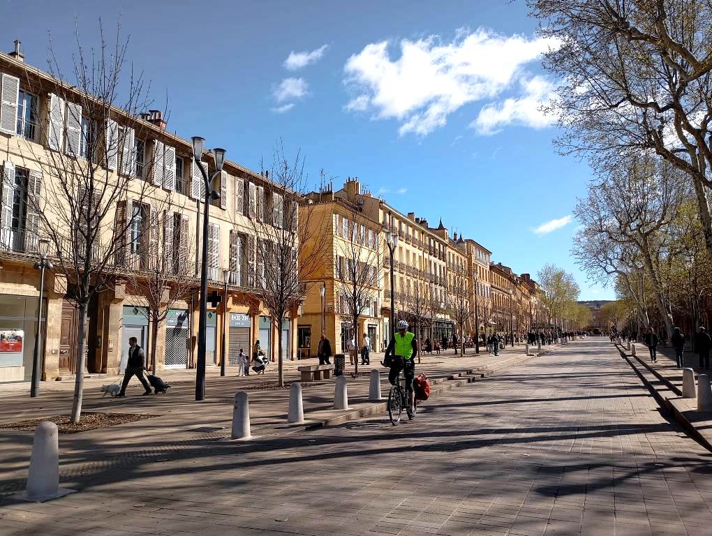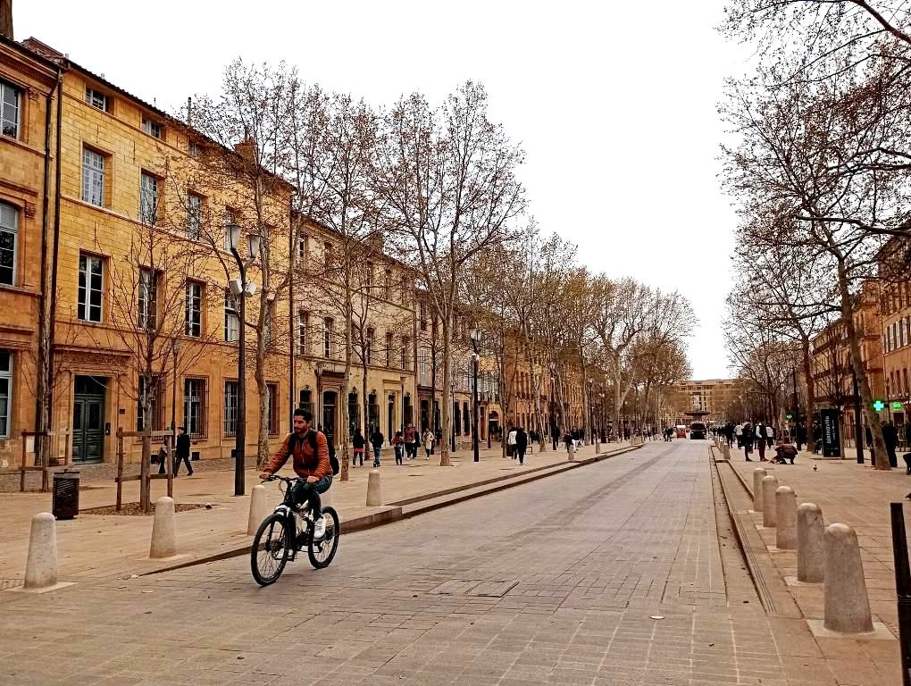 Ποδηλάτες και πεζοί κατακλύζουν την Cours Mirabeau όλες τις ώρες της ημέρας, με οποιεσδήποτε καιρικές συνθήκες.