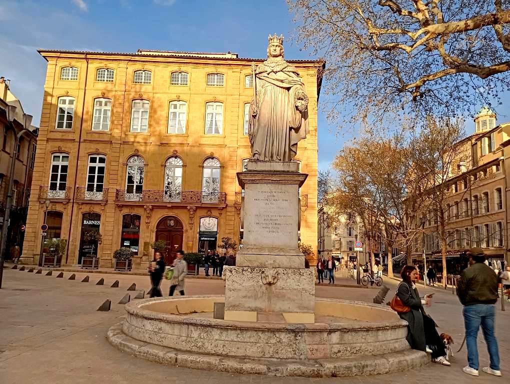 Το 2009 και στο πλαίσιο της 600ής επετείου από τη γέννηση του βασιλιά Ρενέ, πραγματοποιήθηκε η αποκατάσταση του αγάλματός του στην Fontaine du Roi René, που προστατεύεται πλέον ως Ιστορικό Μνημείο. Το σιντριβάνι καταλαμβάνει τη θέση ενός παλαιότερου, σε σχήμα πυραμίδας, που καταστράφηκε κατά τη διάρκεια της Γαλλικής Επανάστασης, σηματοδοτεί δε το ανατολικό άκρο της Cours Mirabeau…
