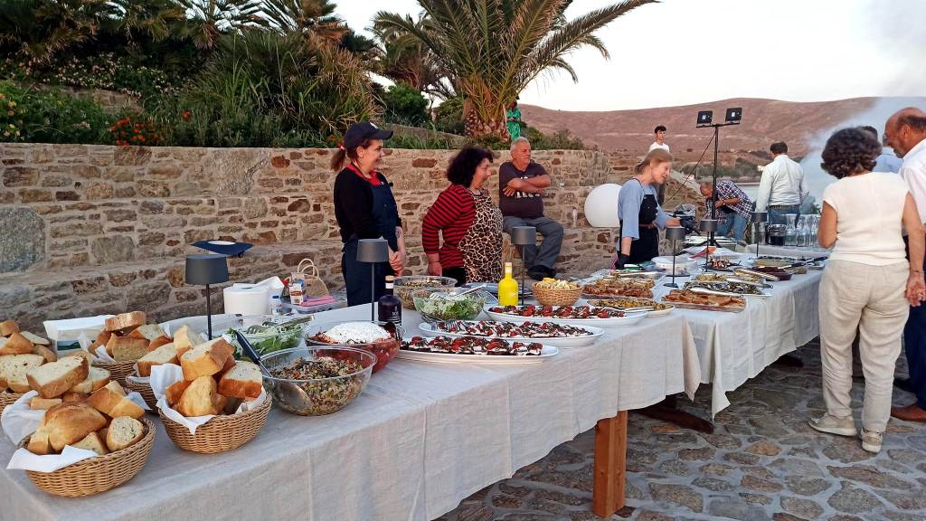 Πόσο μάλλον όταν το τραπέζι αυτό είναι φορτωμένο με εξαιρετικής γεύσης, σύλληψης και παρουσίασης εκλεκτά εδέσματα, που φέρουν την υπογραφή της ταλαντούχας chef Βιβής Σούλιου, με την υποστήριξη βεβαίως όλης της έμπειρης ομάδας της, από το οικογενειακό τους εστιατόριο Cavo Doro, στο Σίγρι. Όταν, επίσης, το ακαταμάχητο ελαιόλαδο και το ούζο της Λέσβου ρέουν άφθονα, όταν ακόμα και ο καιρός είναι ο ιδανικότερος που θα μπορούσε και ναι, το πιστεύω απόλυτα, ότι ακόμα κι αυτό είναι επίτευγμα της θετικής ενέργειας της Φωτεινής και του Αντώνη!