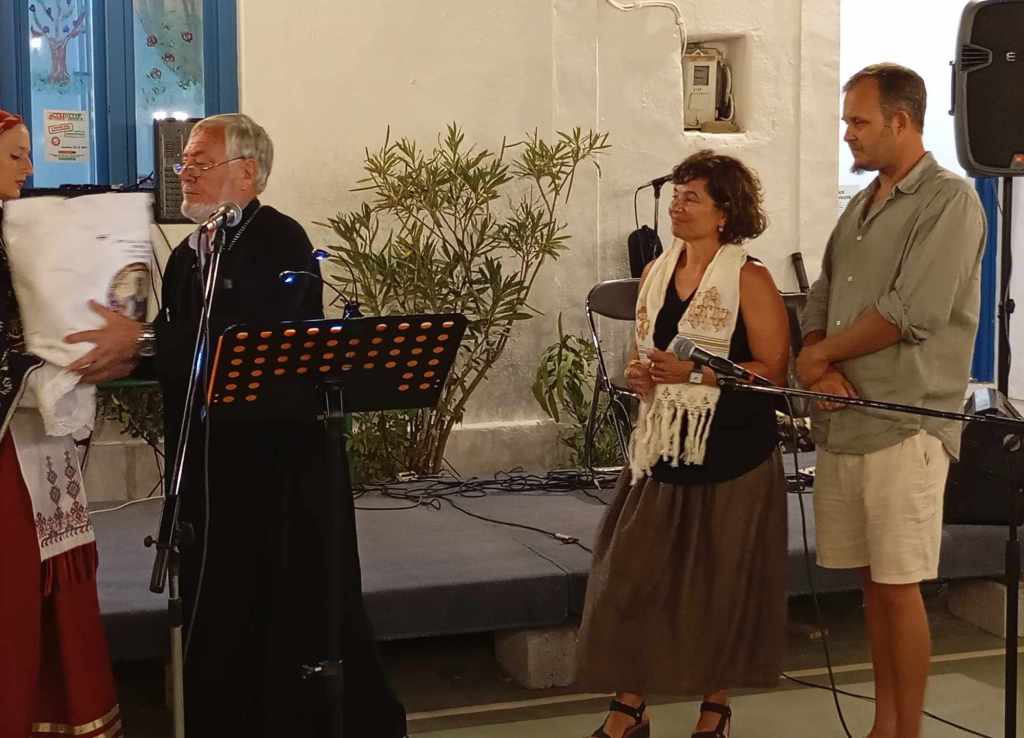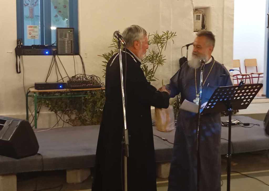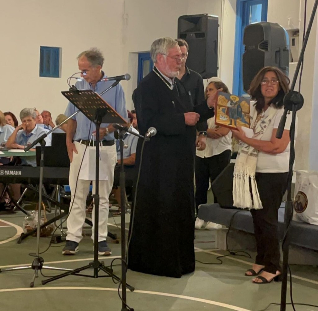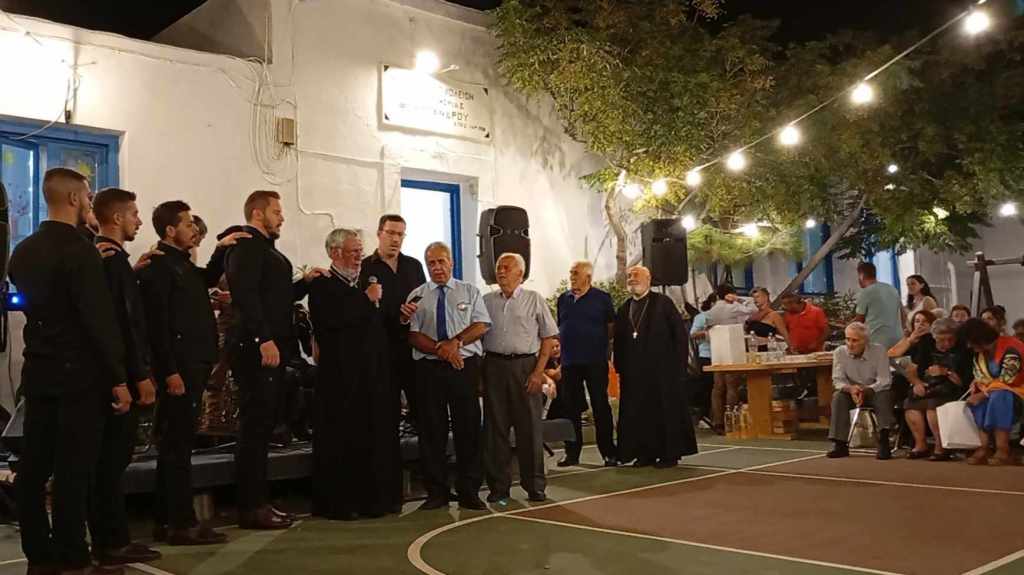 Αυτός μας προσκάλεσε, χωρίς αυτόν δεν θα είμεθα τώρα εδώ. Πατέρα Παναγιώτη, δώσει σοι Κύριος ο Θεός κατά την καρδίαν σου. Χρεωστικώς και οφειλετικώς θέλω να ευχαριστήσω την ιδιαίτερα αγαπητή και αξιότιμη κυρία Κατερίνα Μαρινάκη, που ήταν όχι μόνο η ψυχή, μα και η καρδιά και το σώμα και το πνεύμα, του όλου εγχειρήματος αυτής της επίσκεψης. Τα τηλέφωνα, τα αμέτρητα μηνύματα για να προγραμματισθεί, να στηθεί, να σταθεί και να οργανωθεί αυτή η επίσκεψη, όσα ευχαριστώ και αν πούμε, είναι σταγόνα μέσα στο Αιγαίο πέλαγος που μας περιβάλει. Το Εκκλησιαστικό Συμβούλιο, η Χορωδία μας και οι χορευτές μας, θα είμεθα πάντα υποχρεωμένοι μαζί σου. Ακόμα, ευχαριστίες οφείλουμε στην πλοιοκτήτρια Εταιρεία Seajets του κ. Μάριου Ηλιόπουλου, για την ευγενική τους προσφορά της έκπτωσης 50%, επί των εισιτηρίων μετακίνησής μας. Επίσης, στο Πρακτορείο Diaplous Travel και ειδικά στην κυρία Μαργαρίτα Βενιού, για τη συμβολή της και διευκόλυνσή της, σε ό,τι αφορούσε στη μετακίνησή μας, στην έκδοση των εισιτηρίων και στην εδώ ξενάγησή μας. Ευχαριστίες, επίσης πολλές, σε όλους όσοι συνέβαλαν, βοήθησαν και συνετέλεσαν στην αποψινή βραδιά. Έχω ακόμα υποχρέωση να ευχαριστήσω, τους άξιους και καλούς συνεργάτες μου του Εκκλησιαστικού Συμβουλίου, τόσον αυτούς που είναι εδώ μαζί μας, όσο και αυτούς που για διάφορους λόγους και υποχρεώσεις δεν μπόρεσαν να έλθουν. Να ευχαριστήσω τους καλλιτέχνες, τους μουσικούς μας, την κυρία Λίντα Μανουσάκη και τον Λευτέρη Χατζηδάκη, τους Χορωδούς, γυναίκες και άνδρες, που άφησαν εργασίες και υποχρεώσεις, οικογένειες και παιδιά, για να έλθουν. Τον χοροδιδάσκαλο και Πρόεδρο του Σωματείου «Βιγλάτορες», τον αγαπητό Σήφη Βιγλάκη με την όμορφη παρέα του.