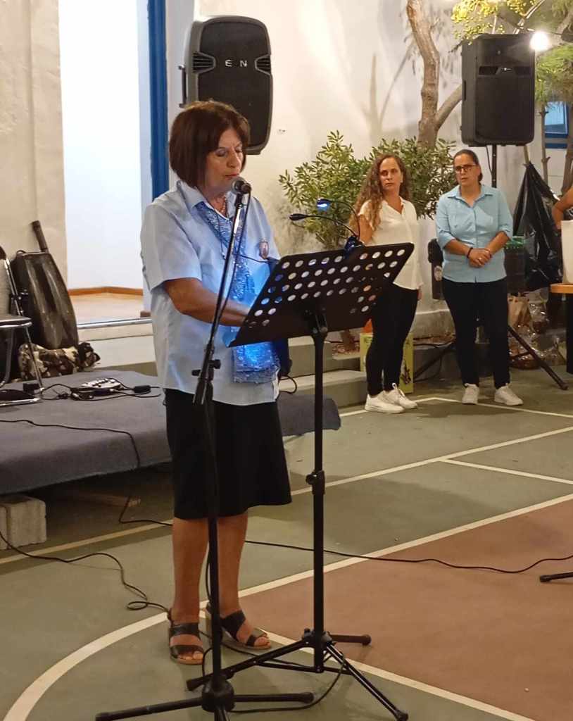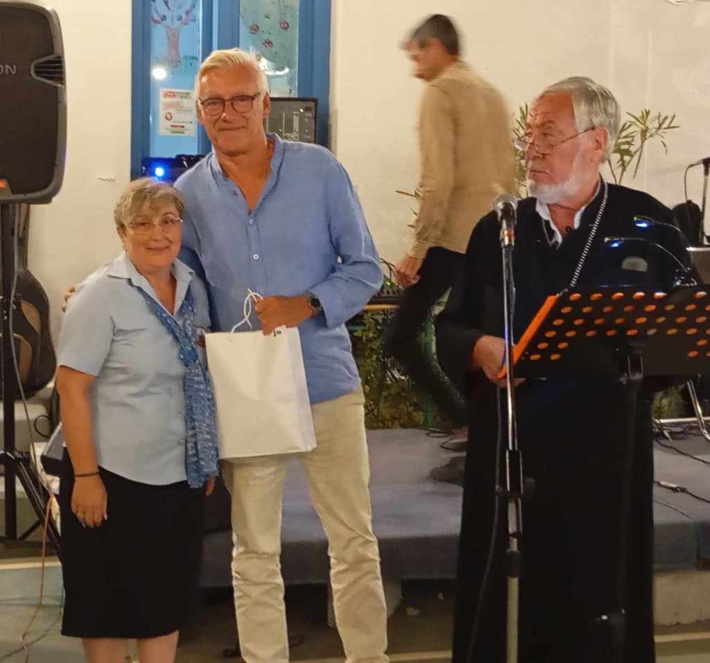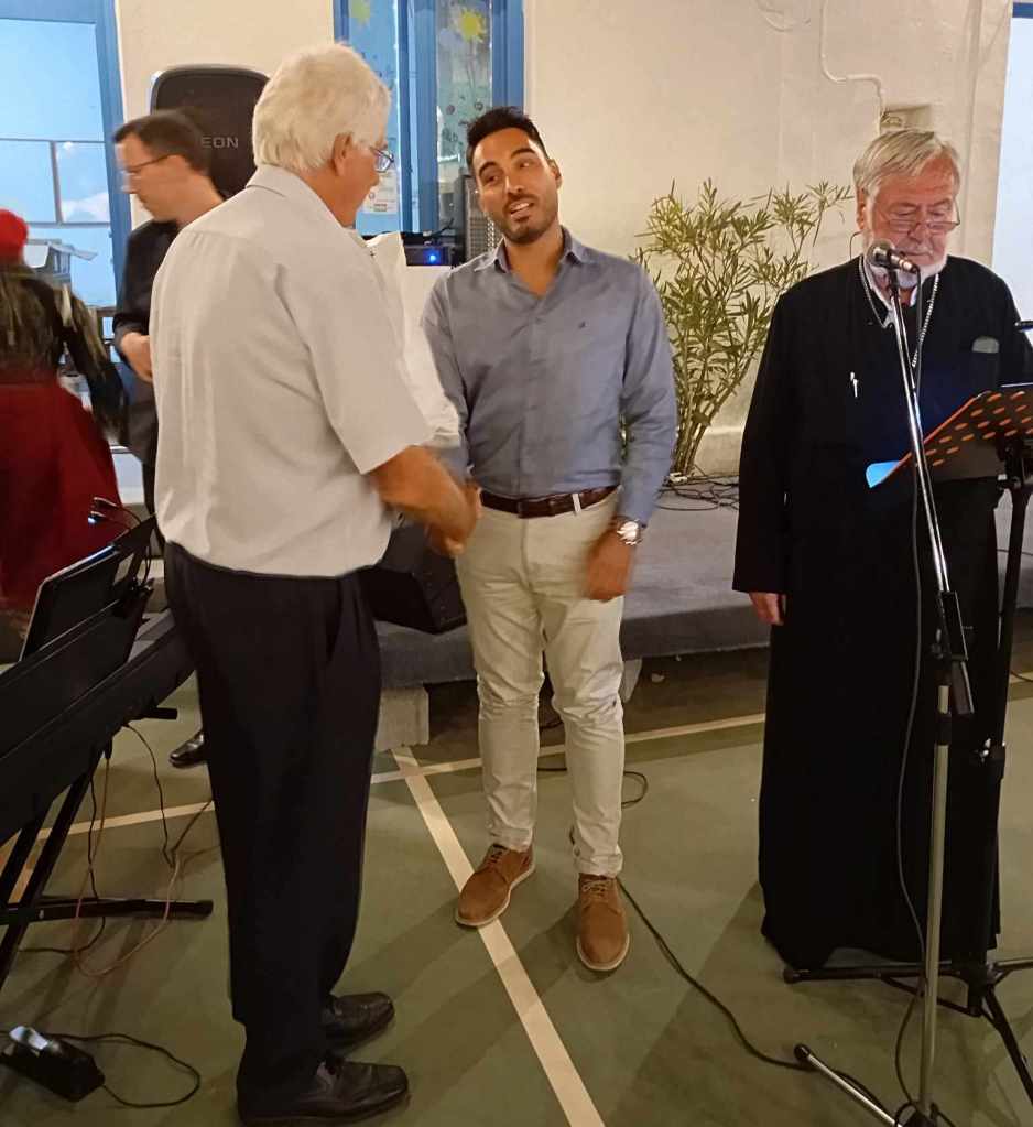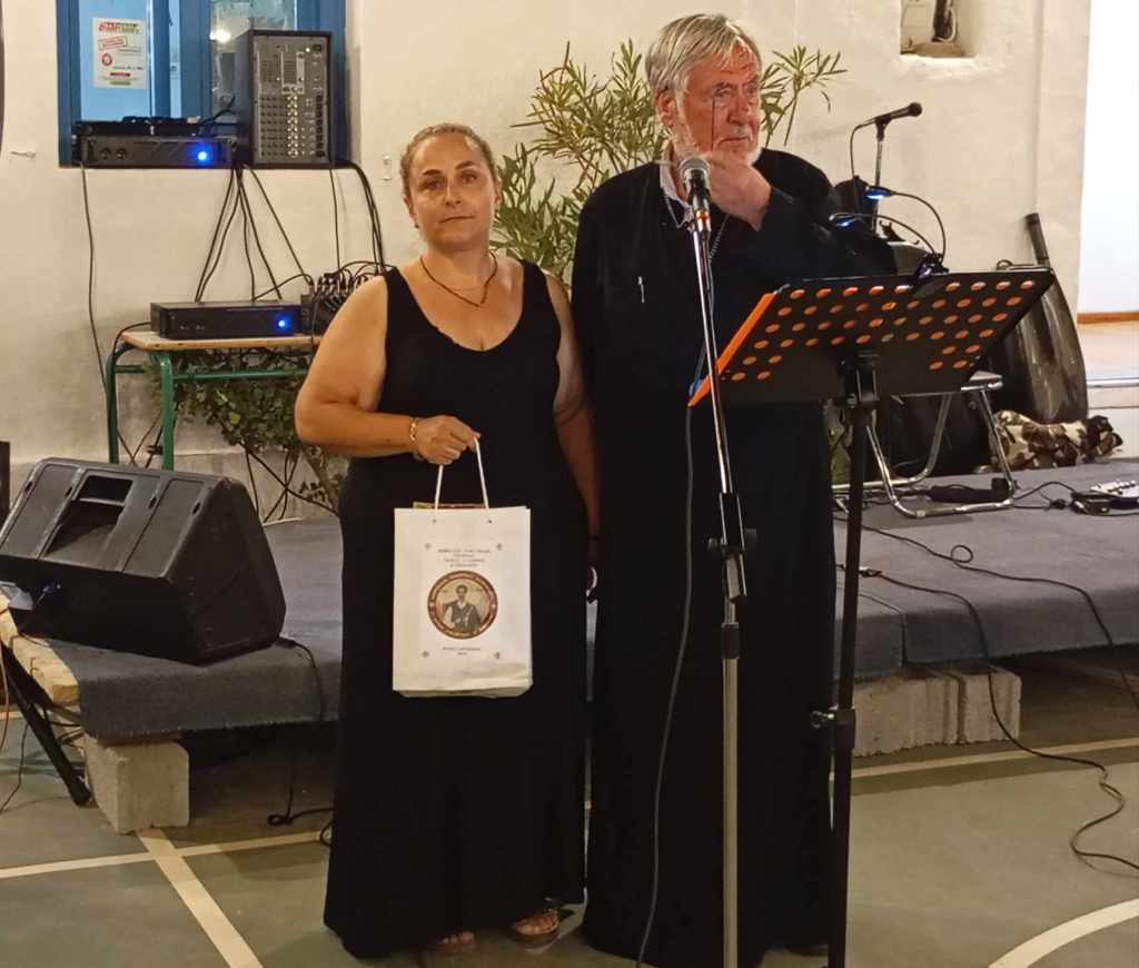 Αυτός μας προσκάλεσε, χωρίς αυτόν δεν θα είμεθα τώρα εδώ. Πατέρα Παναγιώτη, δώσει σοι Κύριος ο Θεός κατά την καρδίαν σου. Χρεωστικώς και οφειλετικώς θέλω να ευχαριστήσω την ιδιαίτερα αγαπητή και αξιότιμη κυρία Κατερίνα Μαρινάκη, που ήταν όχι μόνο η ψυχή, μα και η καρδιά και το σώμα και το πνεύμα, του όλου εγχειρήματος αυτής της επίσκεψης. Τα τηλέφωνα, τα αμέτρητα μηνύματα για να προγραμματισθεί, να στηθεί, να σταθεί και να οργανωθεί αυτή η επίσκεψη, όσα ευχαριστώ και αν πούμε, είναι σταγόνα μέσα στο Αιγαίο πέλαγος που μας περιβάλει. Το Εκκλησιαστικό Συμβούλιο, η Χορωδία μας και οι χορευτές μας, θα είμεθα πάντα υποχρεωμένοι μαζί σου. Ακόμα, ευχαριστίες οφείλουμε στην πλοιοκτήτρια Εταιρεία Seajets του κ. Μάριου Ηλιόπουλου, για την ευγενική τους προσφορά της έκπτωσης 50%, επί των εισιτηρίων μετακίνησής μας. Επίσης, στο Πρακτορείο Diaplous Travel και ειδικά στην κυρία Μαργαρίτα Βενιού, για τη συμβολή της και διευκόλυνσή της, σε ό,τι αφορούσε στη μετακίνησή μας, στην έκδοση των εισιτηρίων και στην εδώ ξενάγησή μας. Ευχαριστίες, επίσης πολλές, σε όλους όσοι συνέβαλαν, βοήθησαν και συνετέλεσαν στην αποψινή βραδιά. Έχω ακόμα υποχρέωση να ευχαριστήσω, τους άξιους και καλούς συνεργάτες μου του Εκκλησιαστικού Συμβουλίου, τόσον αυτούς που είναι εδώ μαζί μας, όσο και αυτούς που για διάφορους λόγους και υποχρεώσεις δεν μπόρεσαν να έλθουν. Να ευχαριστήσω τους καλλιτέχνες, τους μουσικούς μας, την κυρία Λίντα Μανουσάκη και τον Λευτέρη Χατζηδάκη, τους Χορωδούς, γυναίκες και άνδρες, που άφησαν εργασίες και υποχρεώσεις, οικογένειες και παιδιά, για να έλθουν. Τον χοροδιδάσκαλο και Πρόεδρο του Σωματείου «Βιγλάτορες», τον αγαπητό Σήφη Βιγλάκη με την όμορφη παρέα του.