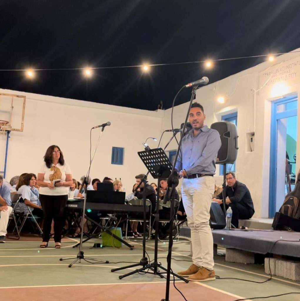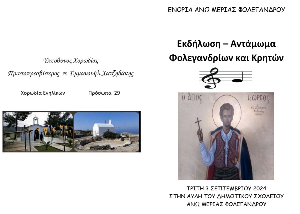 Άγιε Αρχιερατικέ, Πολυσέβαστε Γέροντα πάτερα Παναγιώτη, Κύριε Περιφερειακέ Σύμβουλε, κύριε Δήμαρχε, κύριοι Αντιδήμαρχοι, κυρίες και κύριοι Πρόεδροι Πολιτιστικών και άλλων Συλλόγων και Επαγγελματικών Σωματείων. Αγαπητή μου κυρία Κατερίνα Μαρινάκη, εκδότρια των εκδόσεων «Μικρές Κυκλάδες – Ταξιδεύοντας στο Αιγαίο» και της εφημερίδας «Τα Νέα της Φολεγάνδρου», κύριε Βασίλη Τσούνη, Διευθυντή των προαναφερθεισών Εκδόσεων, αγαπητοί μου συνεργάτες, μουσικοί, χορωδοί και χορευτές, κυρίες και κύριοι. Με παλλόμενη την καρδιά μας από αισθήματα συγκίνησης, ρίγους και αγάπης προς όλους σας, καταφθάσαμε στον τόπο καταγωγής του Αγίου ενδόξου Νεομάρτυρος Γεωργίου του Διβόλη, ώστε να αποτίσουμε φόρον τιμής και ευγνωμοσύνης στα Ιερά χώματα της Φολεγάνδρου, για το παλληκάρι των Μαρτύρων της Εκκλησίας μας, που το αίμα του, είχε ηρωισμό, ανδρεία και γενναιότητα, συστατικά αυτού του ωραίου Νησιού, που μετέφερε στην περιοχή μας. Αυτά τα συστατικά, σε νεαρά ηλικία, τον οδήγησαν στον δρόμο του Μαρτυρίου και τον ανέδειξαν μεγάλο Μάρτυρα της Αγίας μας Εκκλησίας και ήρωα της πατρίδος. Έδωσε αίμα και έλαβε Πνεύμα, Χάρη και Αγιότητα. Σήμερα, συναντούνται στο πρόσωπο του προστάτη της Χορωδίας μας, δύο νησιά, δύο διαφορετικοί τόποι, δύο διαφορετικοί πολιτισμοί και γινόμαστε μια ψυχή σε διαφορετικά σώματα.