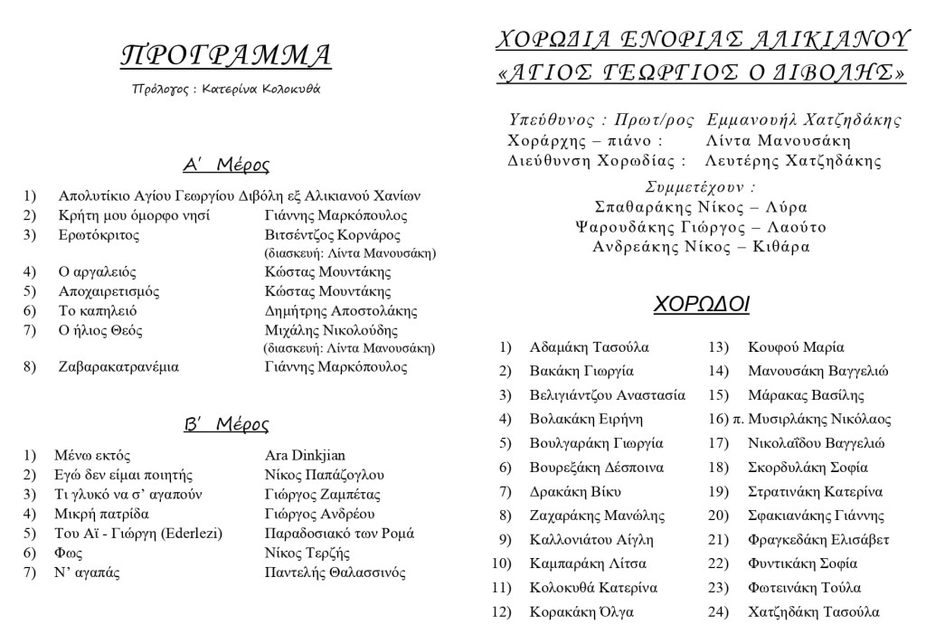 1.Κρητικά και Έντεχνα τραγούδια από τη Χορωδία Ενηλίκων «Άγιος Γεώργιος Διβόλης», με υπεύθυνο τον Πρωτοπρεσβύτερο Εμμανουήλ Χατζηδάκη, Χοράρχη την Λίντα Μανουσάκη και Διευθυντή τον Ελευθέριο Εμμ. Χατζηδάκη